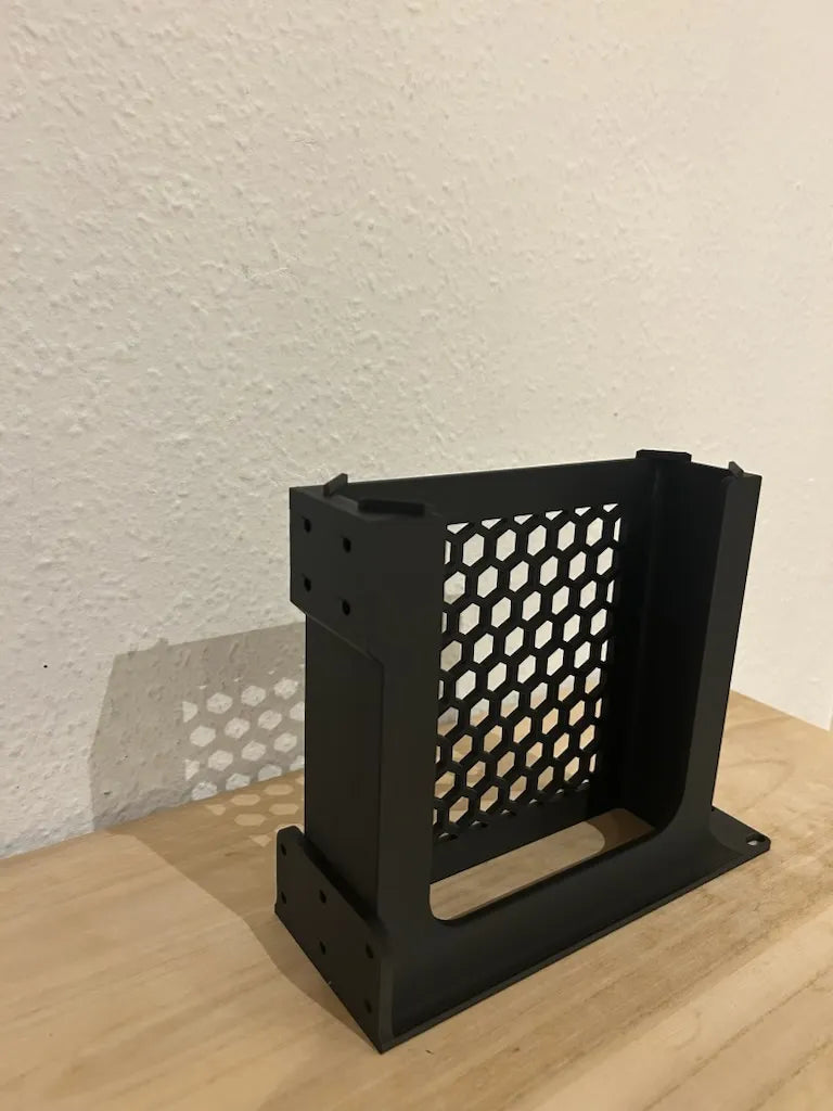 Dette 19-tommer rackbeslag organiserer to Minisforum MS-01 enheder i dit serverrack. Designet understøtter varmebestandigt materiale som PETG for sikker drift. Der findes versioner med plads til gummifødder eller keystone-stik for optimal kabelstyring. Montering kræver M5 møtrikker og skruer for stabil installation.