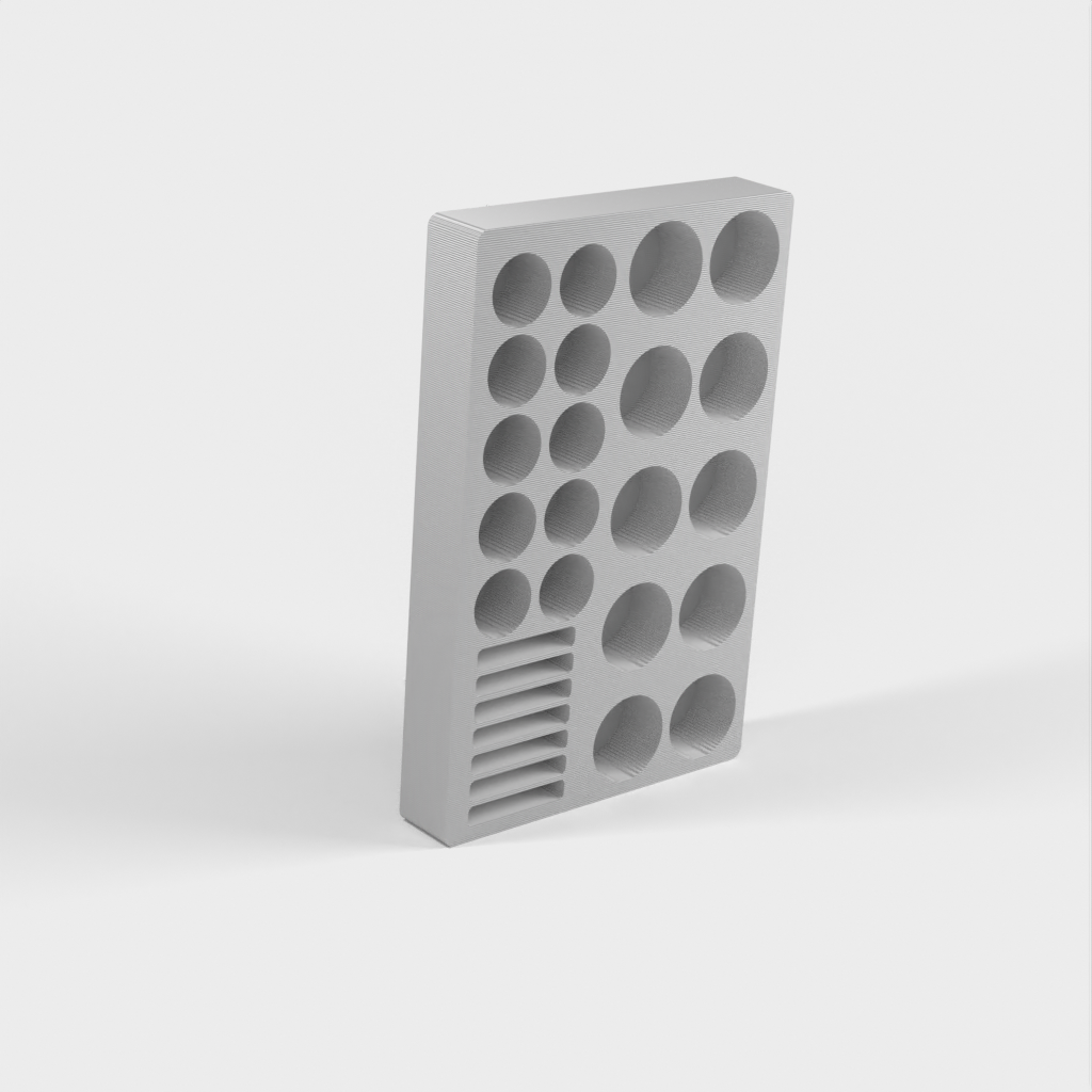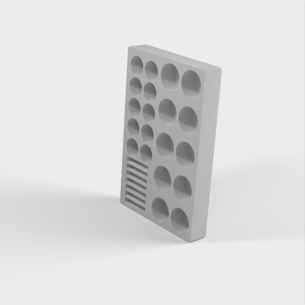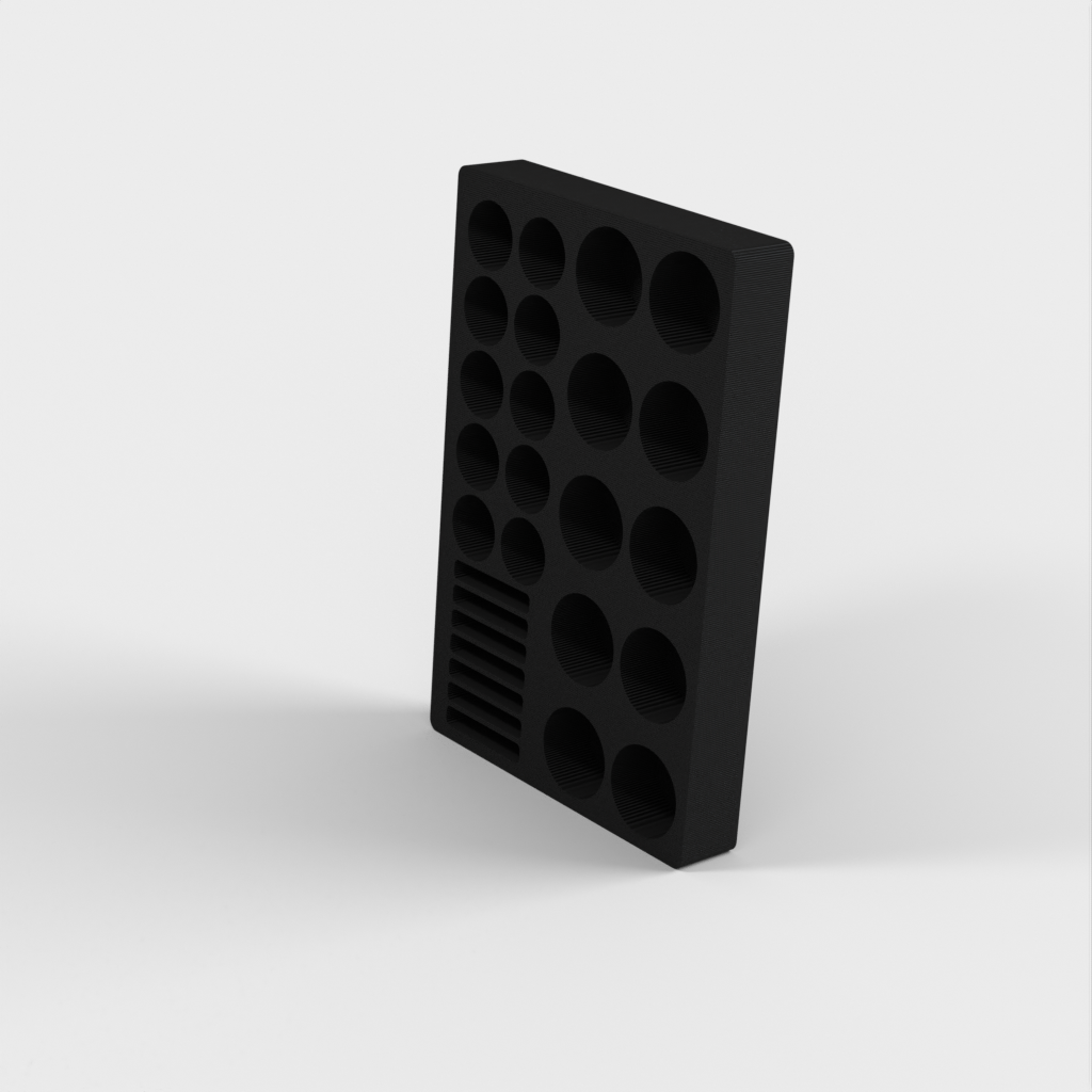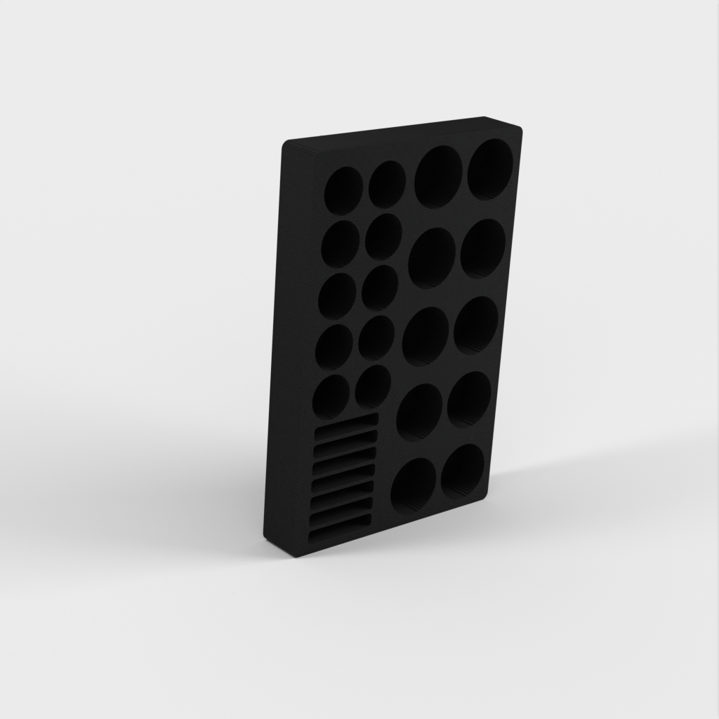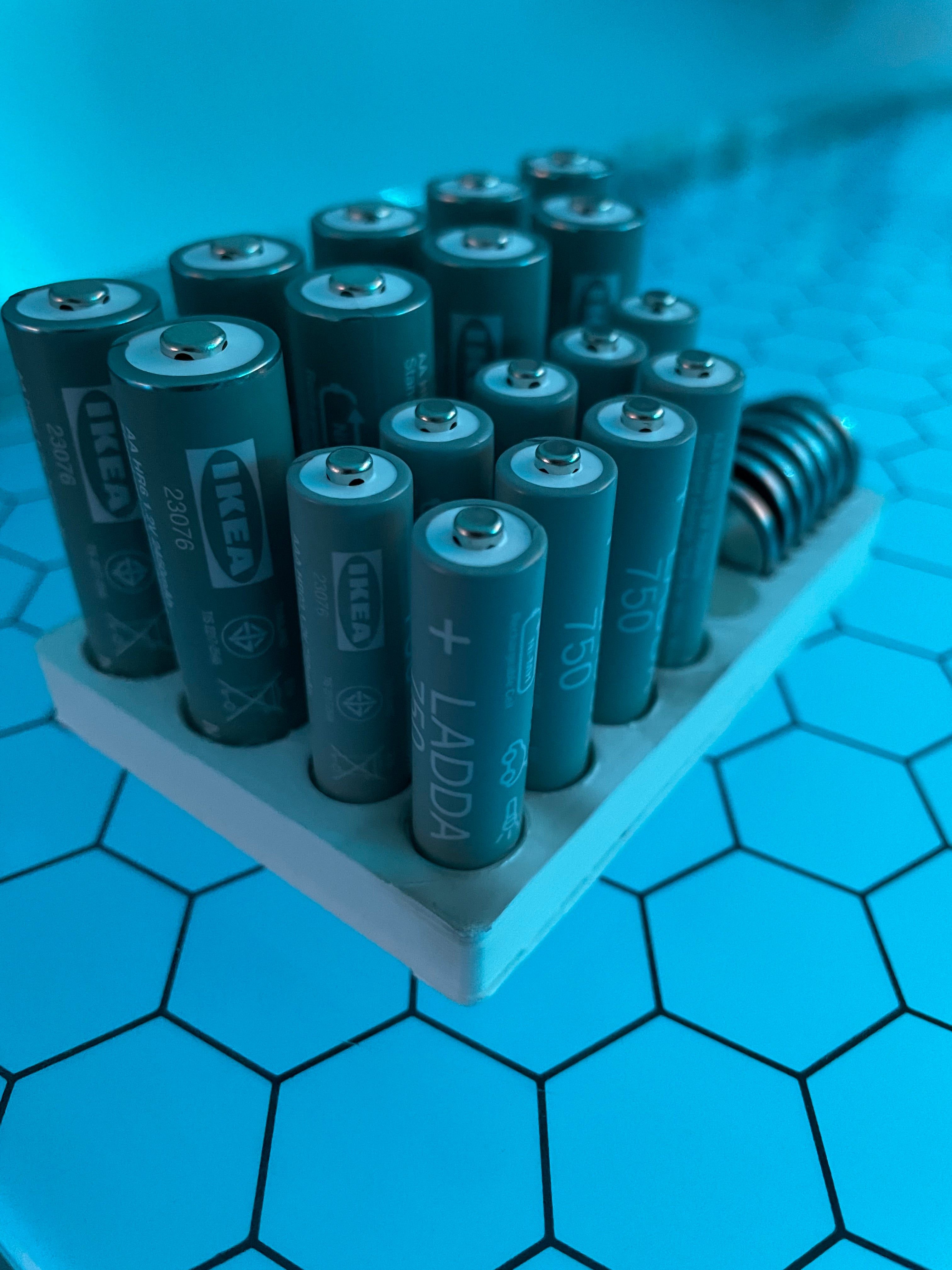 Ein Batteriehalter speziell für AA-, AAA- und CR2032-Batterien. Es wurde speziell für IKEA Ladda-Batterien entwickelt, passt aber auch für Batterien anderer Marken, sofern diese nicht dünner als Batterien normaler Größe sind. Der Halter bietet Platz für 10 AA-, 10 AAA- und 7 CR2032-Batterien. Dies trägt dazu bei, dass Ihre Batterien organisiert und leicht zugänglich bleiben.