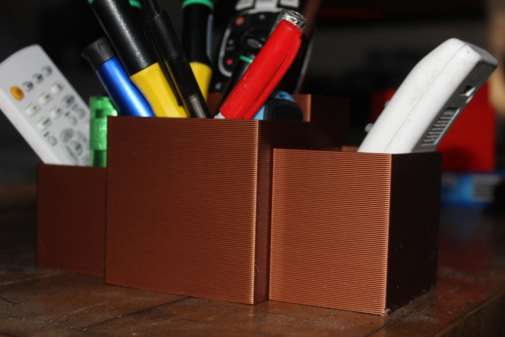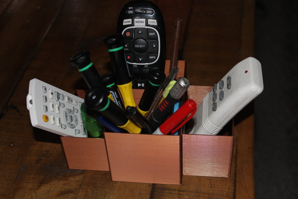 Dies ist ein Fernbedienungshalter für die Tischplatte. Es ist ideal, um Ihre Fernbedienungen und andere kleine Gegenstände wie Kugelschreiber, Bleistifte usw. in Ordnung zu halten. Legen Sie einfach Ihre Fernbedienung oder was auch immer in die Halterung passt, und schon haben Sie alles organisiert an einem Ort.