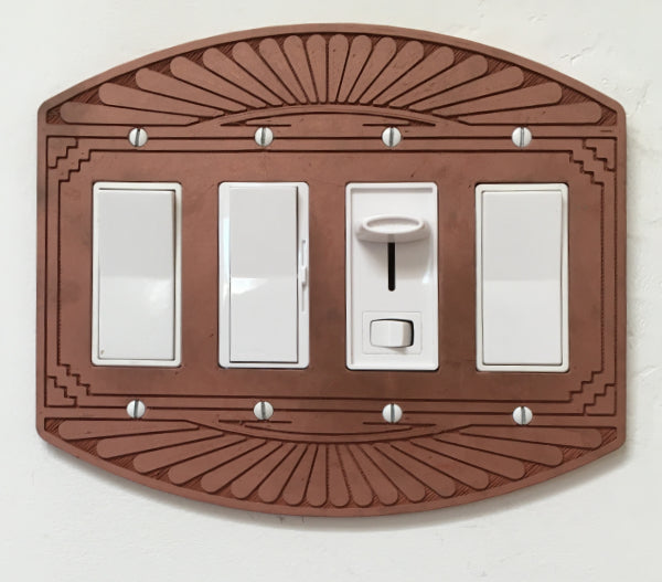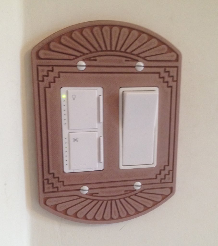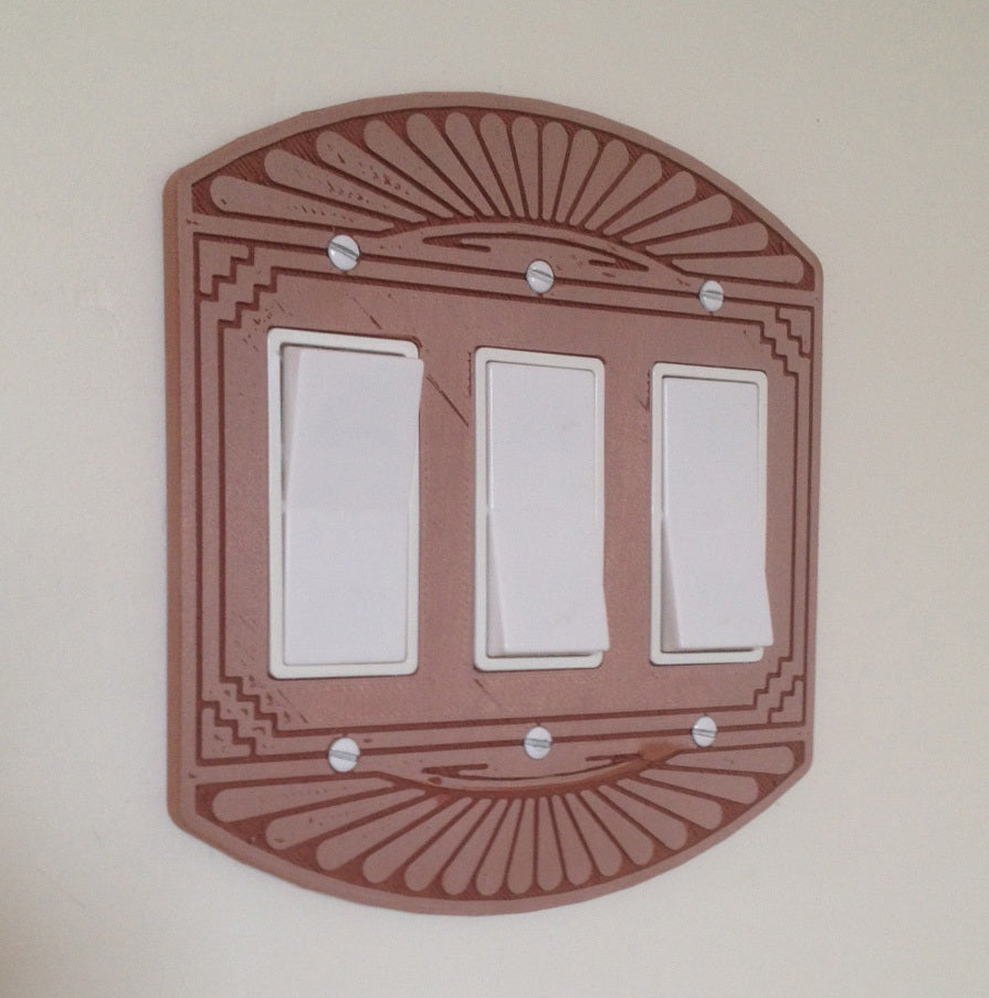 Dies ist eine dekorative Lichtschalterabdeckung, hergestellt aus ColorFabb Copperfill PLA. Trotz einiger kleinerer Herausforderungen ist es der Platte gelungen, mit der Zeit farblich leicht nachzudunkeln, ohne jedoch einen türkisfarbenen Farbton zu entwickeln. Diese Schalterabdeckung verleiht jedem Raum eine einzigartige und schöne Note.