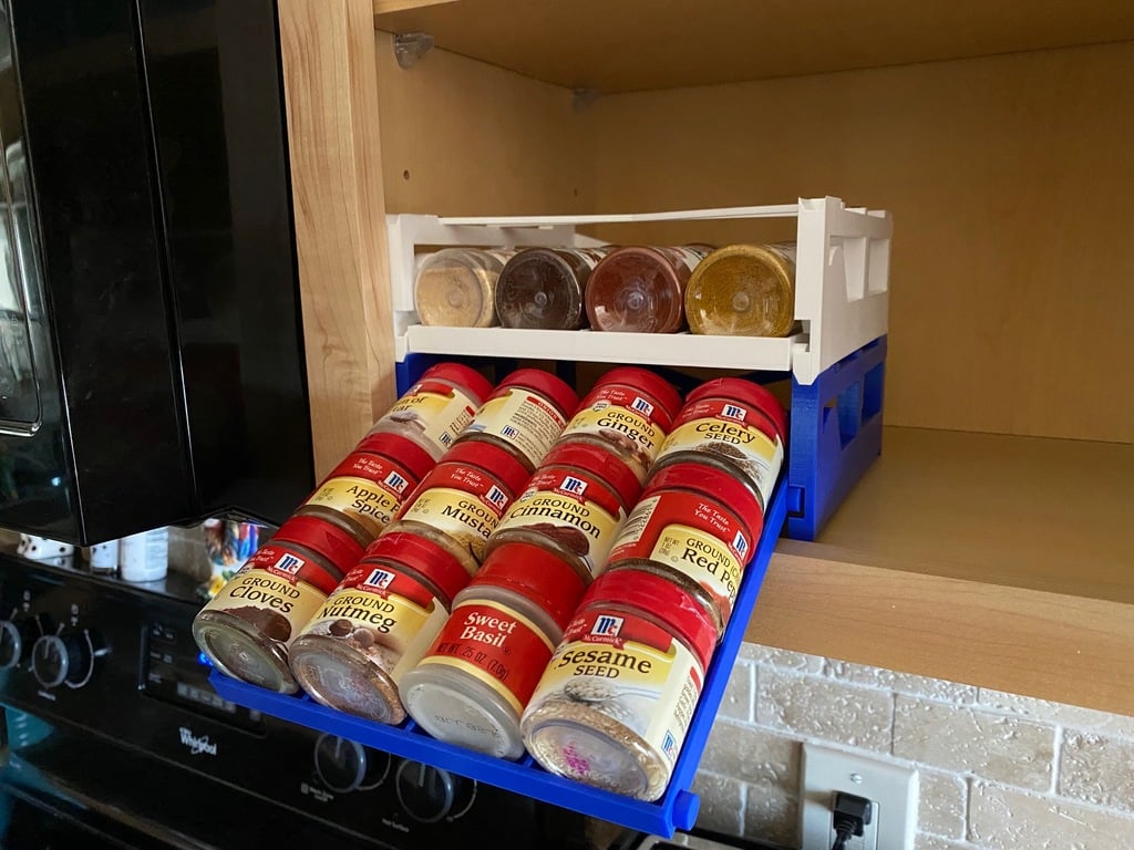 Das Regal verfügt über ausziehbare und klappbare Schubladen. Dadurch sind die Etiketten der Gewürze, auch die im hinteren Bereich, gut sichtbar und der Zugriff deutlich verbessert. Um unterschiedlichen Aufbewahrungsbedürfnissen gerecht zu werden, ist dieses System mit zwei verschiedenen Schubladentypen und -höhen erhältlich. So können Sie Ihre Gewürzaufbewahrung genau an Ihre Küchenplanung und Ihre individuellen Flaschengrößen anpassen. So nutzen Sie optimal Platz und haben Ihre Gewürze stets griffbereit.