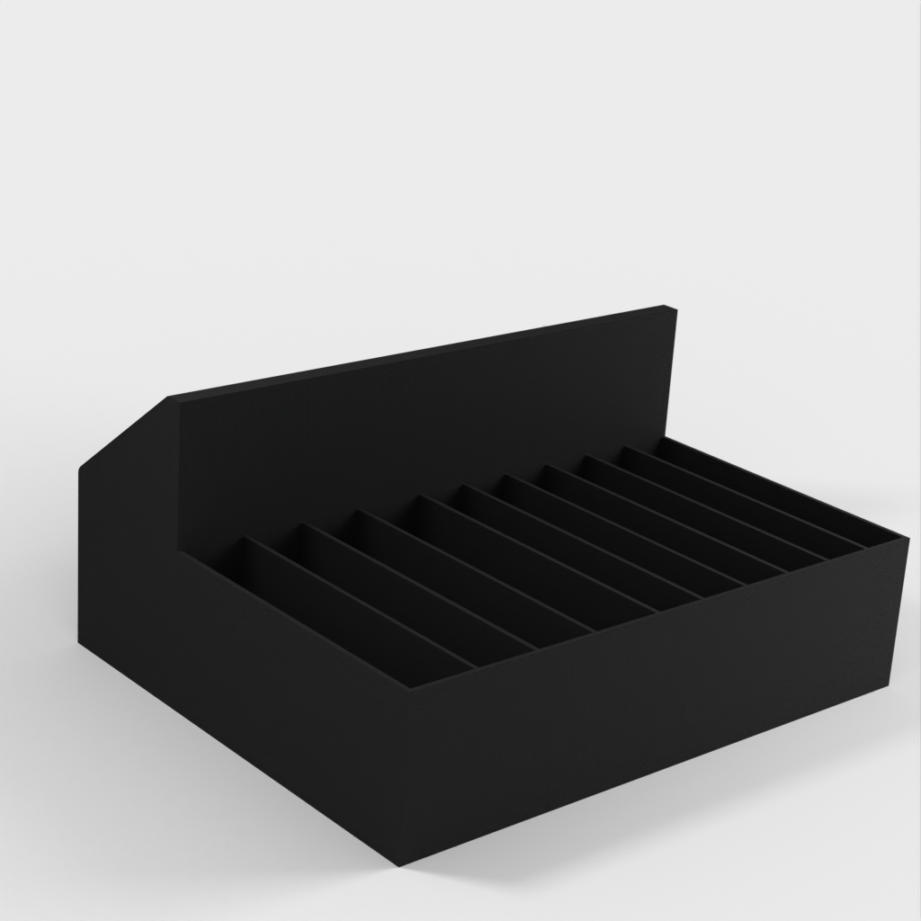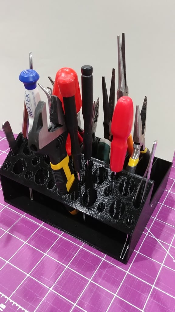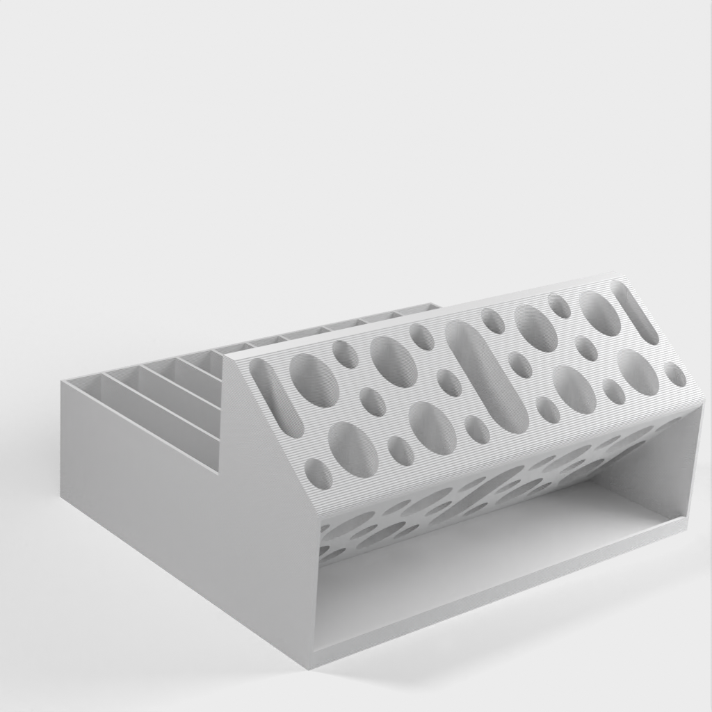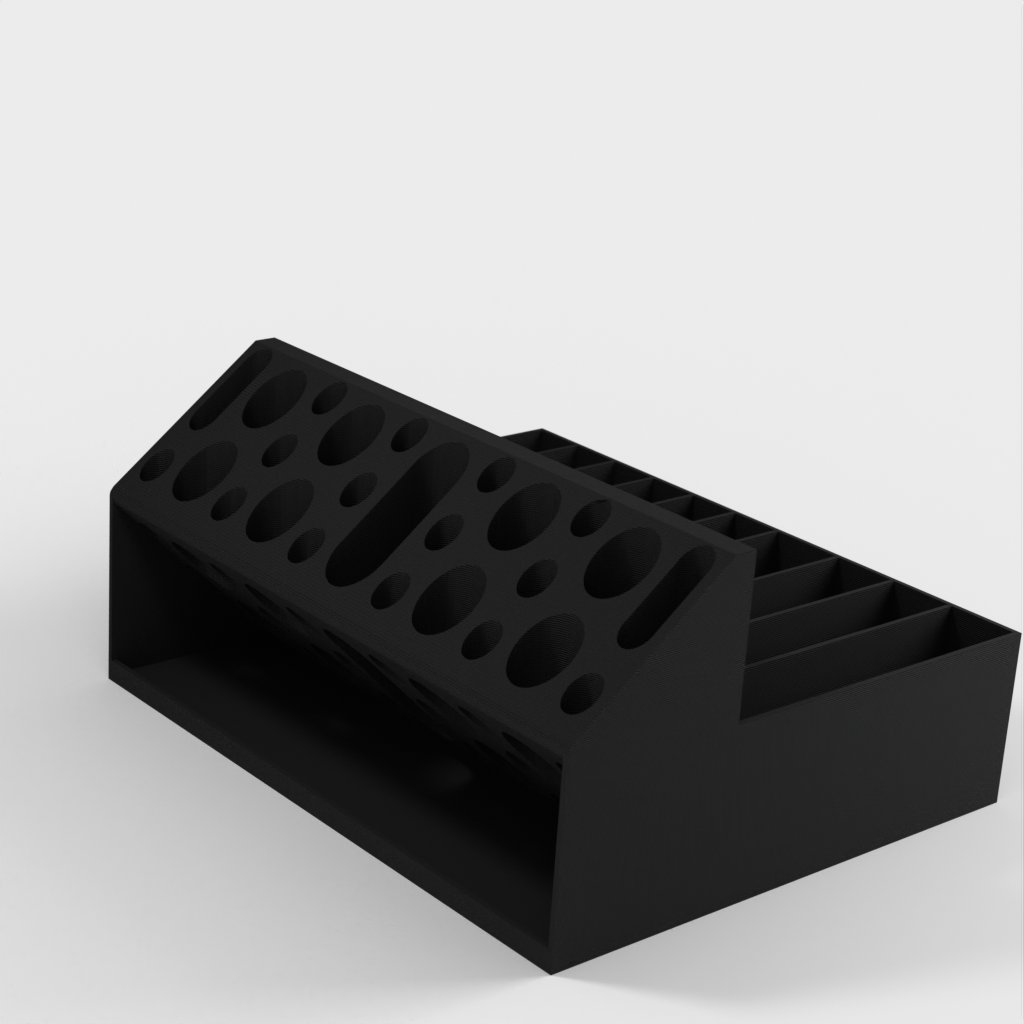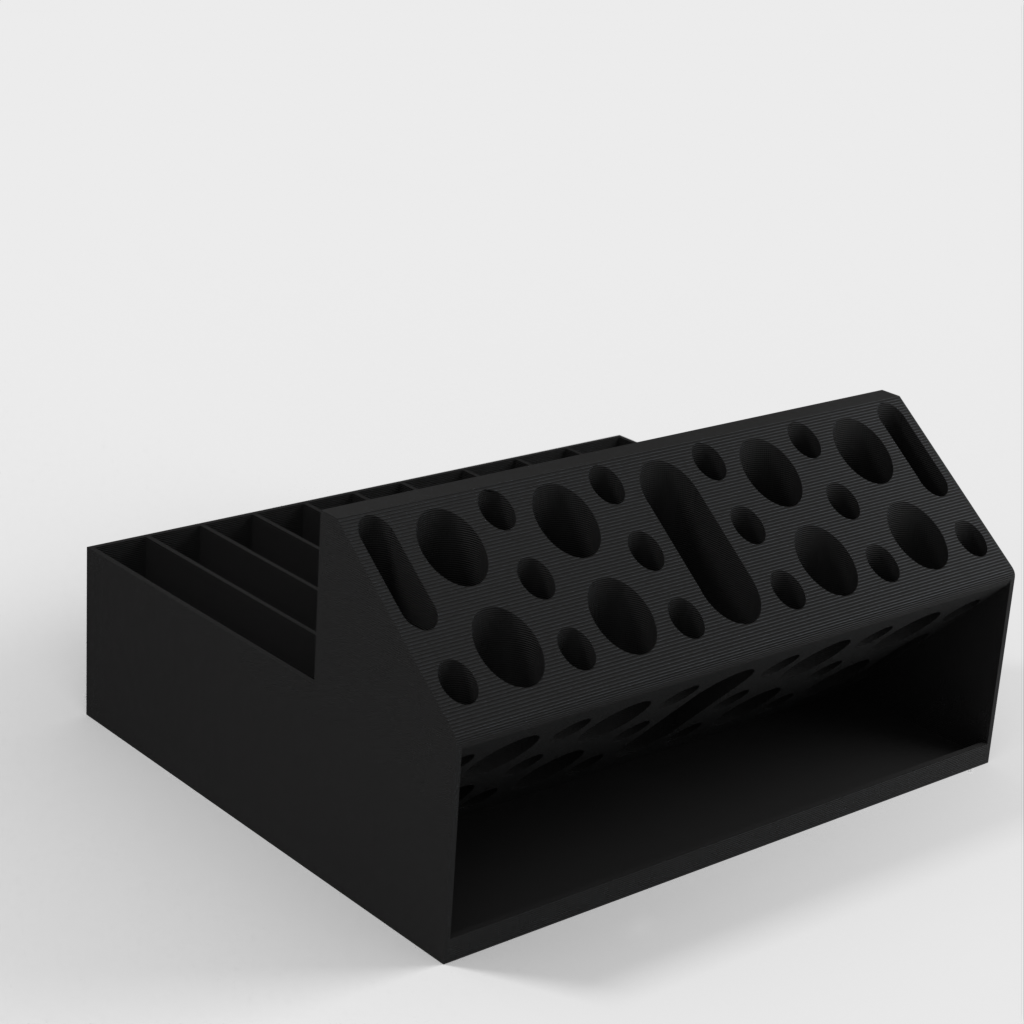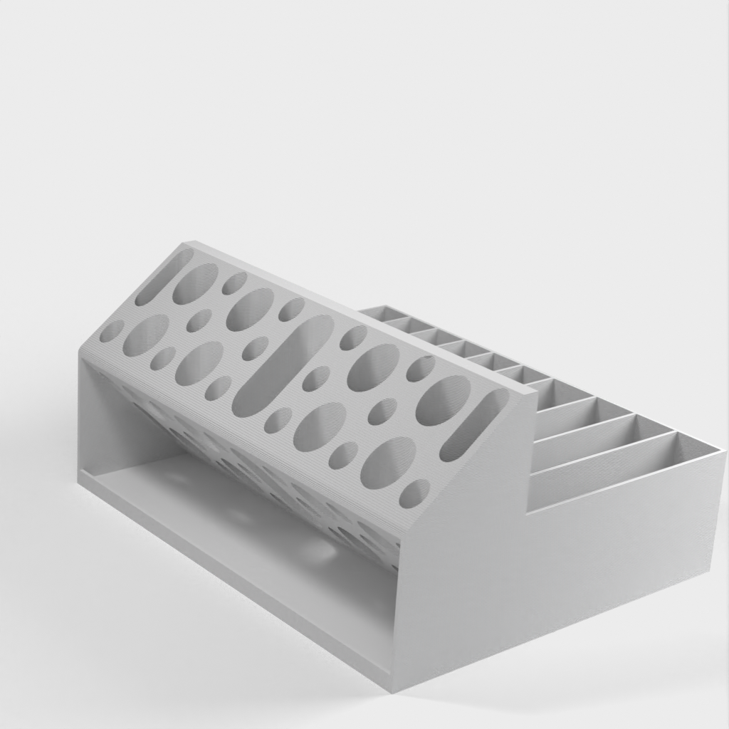 Dieser Zangenhalter Remix wurde entwickelt, um Ihre Werkzeugsammlung einfacher zu organisieren. Es verfügt über größere ovale Löcher für einen Gabelschlüssel und breitere Schlitze für dickere Zangengriffe. Am unteren Rand des runden Lochabschnitts ist eine Lippe angebracht, um zu verhindern, dass kleinere Gegenstände heraus-/durchrutschen. Perfekt für 3D-Drucker, Bastler, Schreibtischorganisation und Werkstattaufbewahrung.