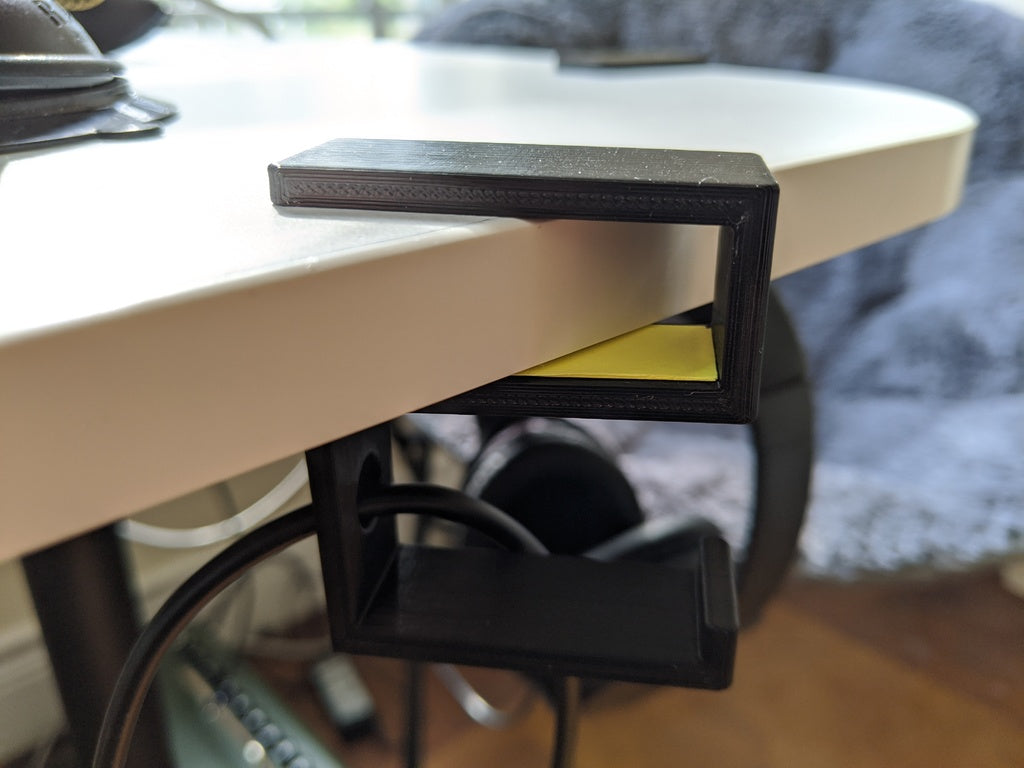 Dies ist eine Remix-Version eines Hakens, der für den IKEA BEKANT-Schreibtisch entworfen wurde. Der ursprüngliche Haken war zu klein, daher hat diese Version einen breiteren oberen Haken. Mit Hilfe einiger Haftnotizen zur Verfeinerung passt es perfekt.