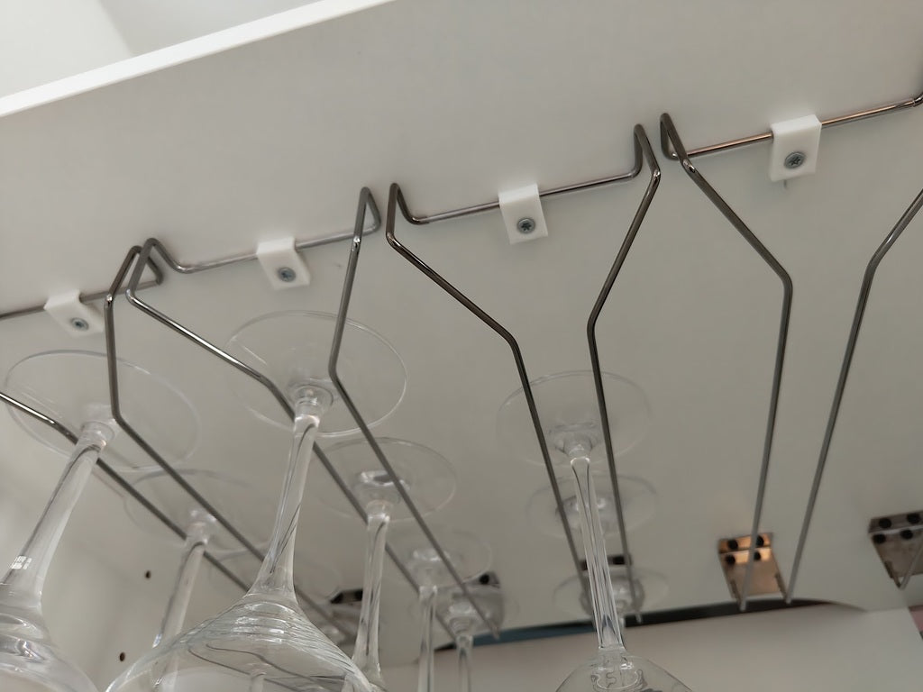 Dies ist eine kleine Halterung zur Montage der IKEA Besta Glashalter (304.119.53) auf jedem Regal – in unserem Fall einem IKEA Metod Küchenschrank. Als Schraube kommt Spax 3,5x20 zum Einsatz.