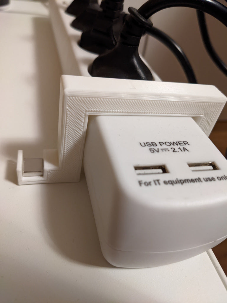 Eine praktische Steckdose für ein Ikea-Bror-Regal. Die Halterung verwendet einen 10 mm x 10 mm großen Magneten, um eine Steckdosenleiste sicher im Regal zu befestigen. Abhängig von der im Dateinamen angegebenen Abzweigabgangsbreite und -höhe sind mehrere STL-Dateien verfügbar.