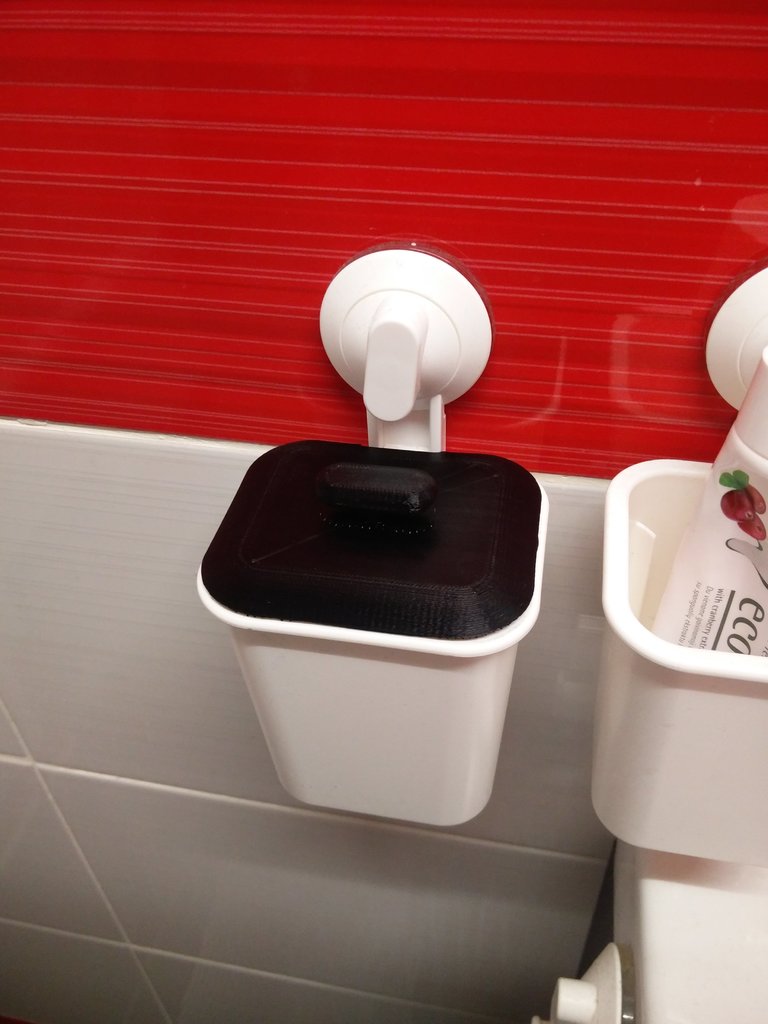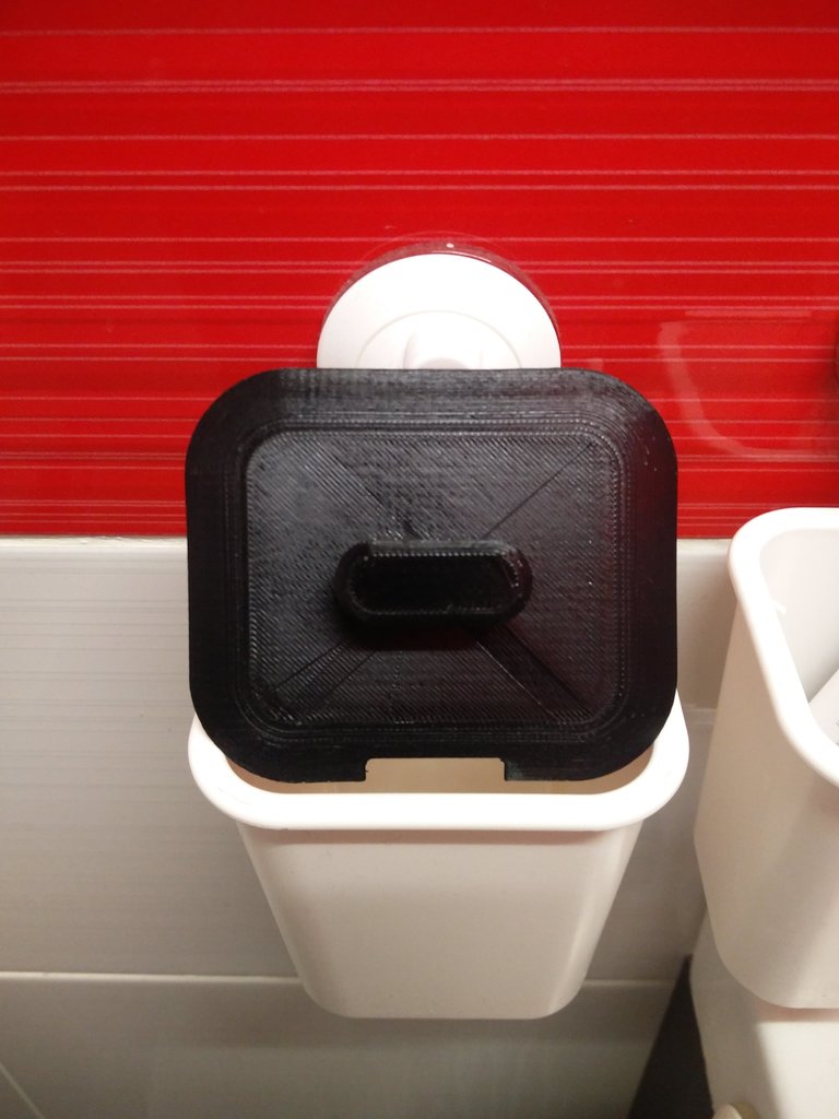 Ein einfacher Deckel für einen Zahnbürstenbehälter aus der Stugvik-Serie von IKEA, der als kleiner Abfallbehälter gestaltet ist. Der Deckel ist mit einem Griff ausgestattet, der zum Rest der Stugvik-Reihe passt. Alles, was Sie tun müssen, ist, eine kleine Plastiktüte in den Behälter zu legen und schon haben Sie einen kompakten Abfallbehälter, perfekt für das Badezimmer.