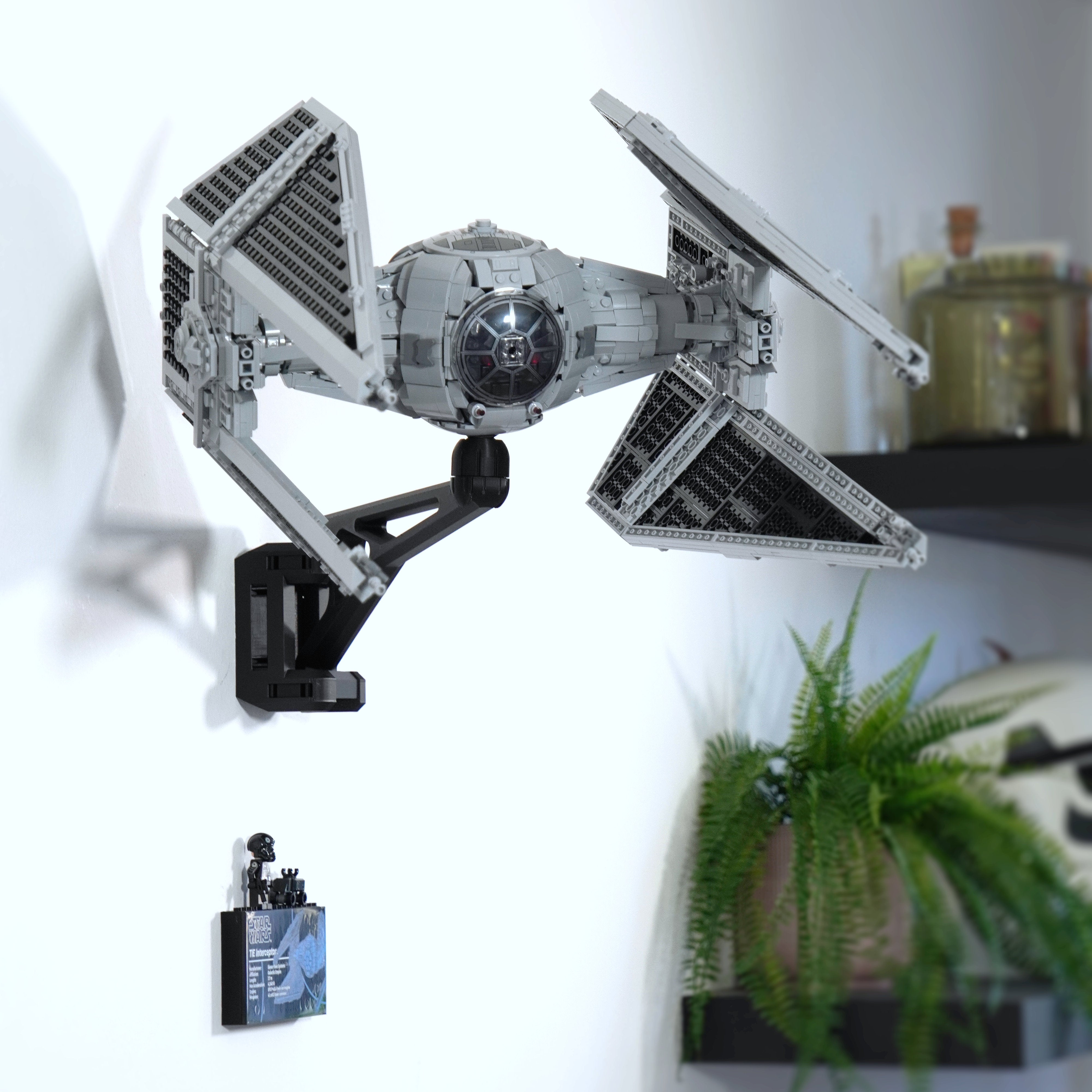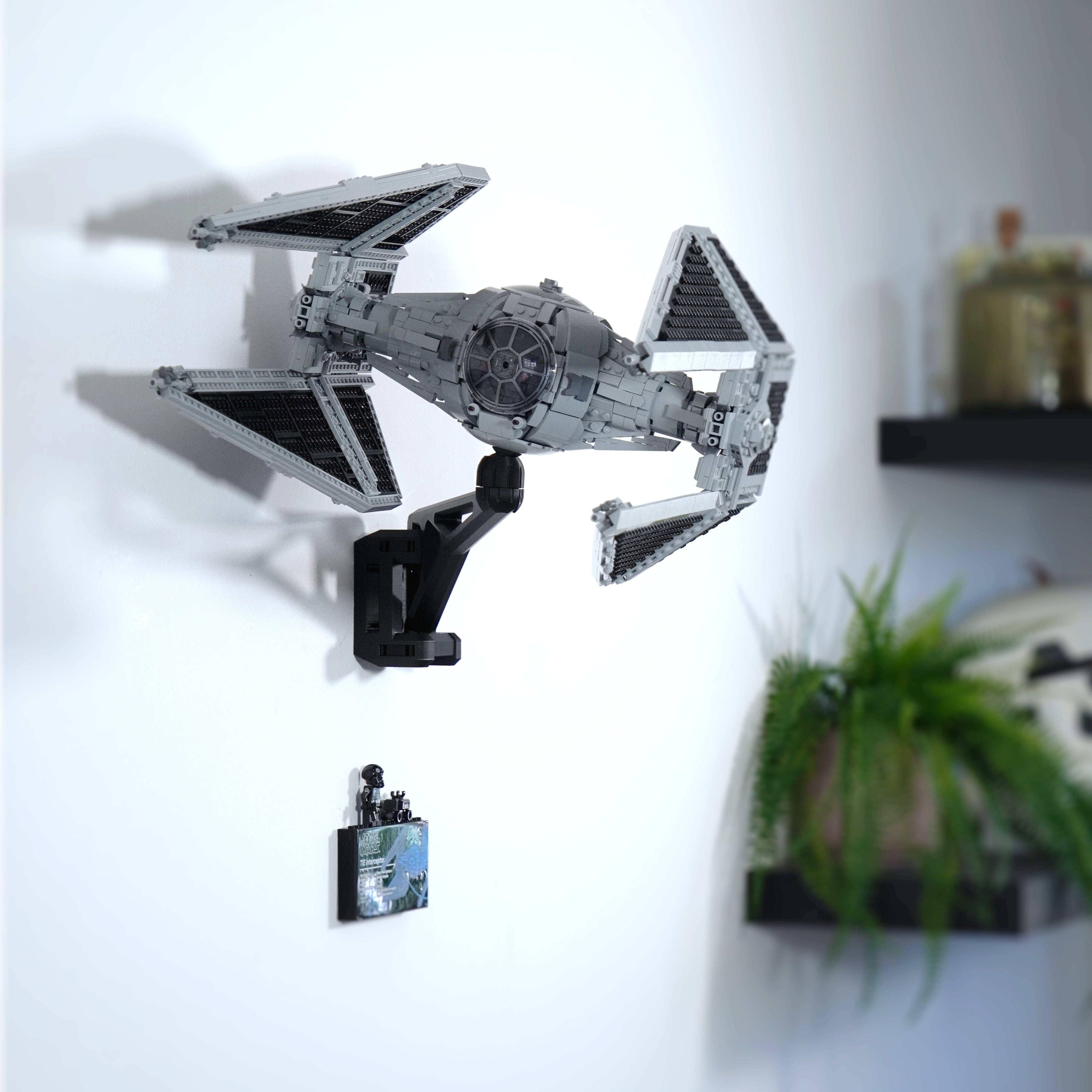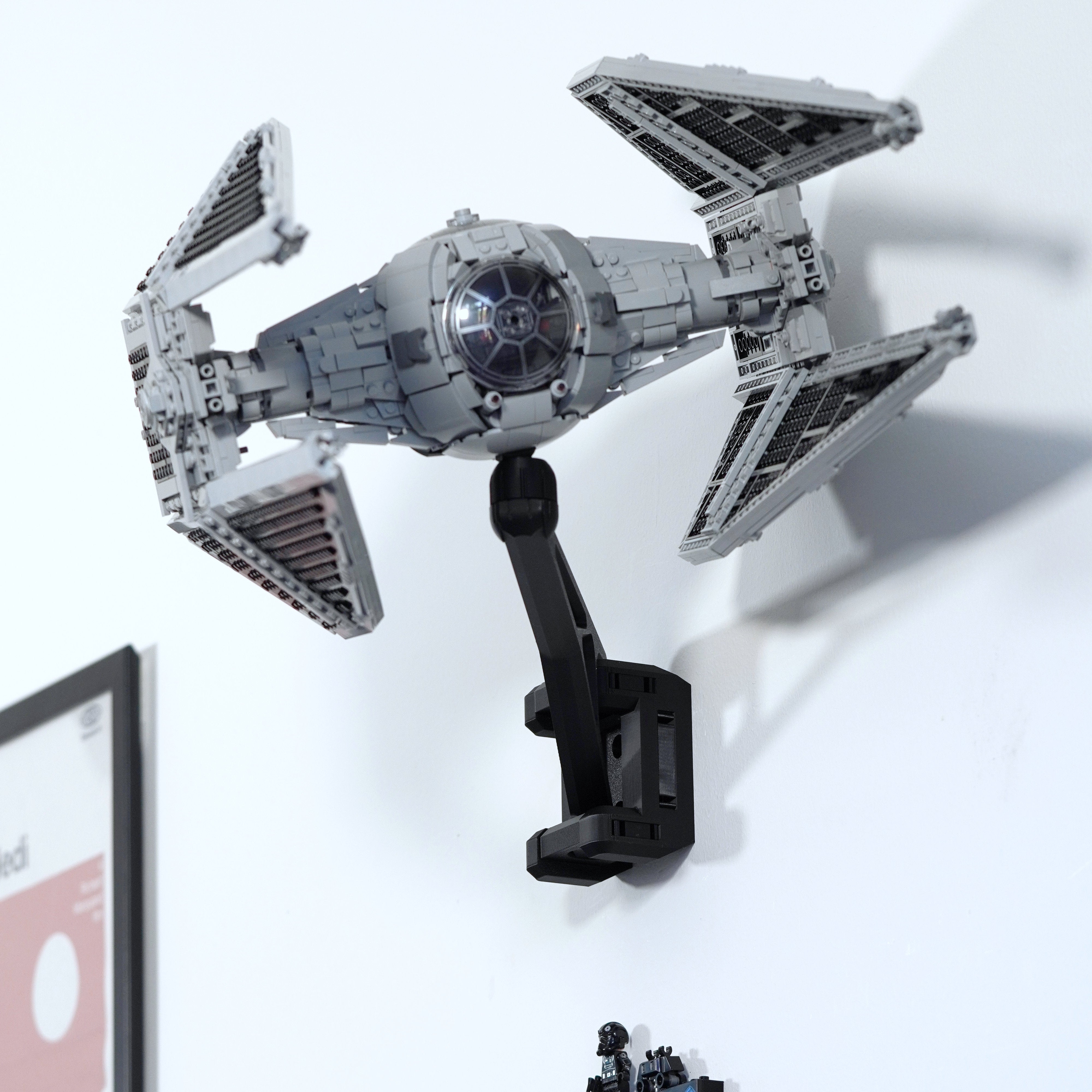 Dette justerbare vægophæng fremviser din UCS Tie Interceptor sikkert og elegant. Den har en drejelig arm og kugleled, der giver mulighed for alsidige vinkler og positioner. Løsningen inkluderer også en separat holder til informationspladen og minifigurer, hvilket sikrer en komplet præsentation af din samling.