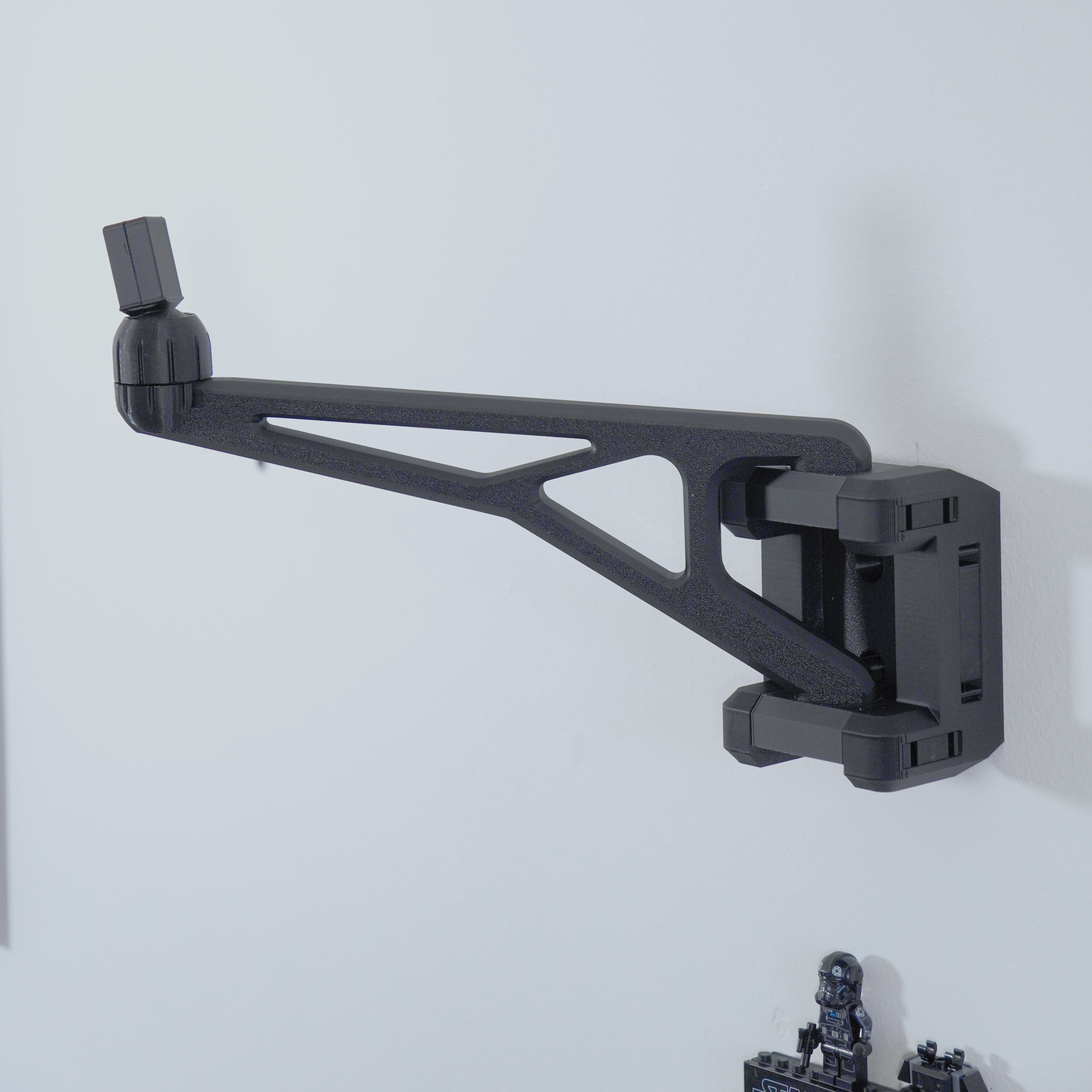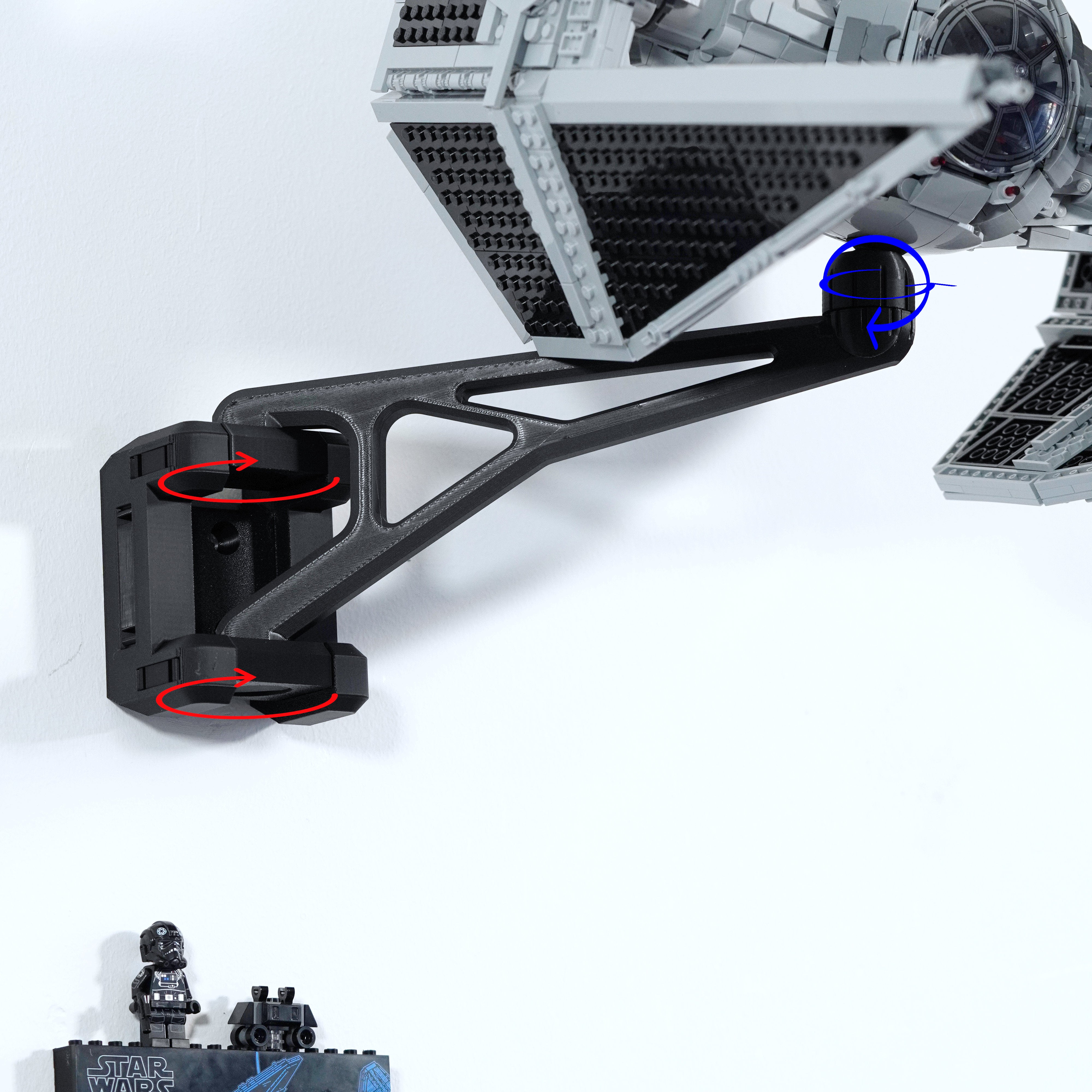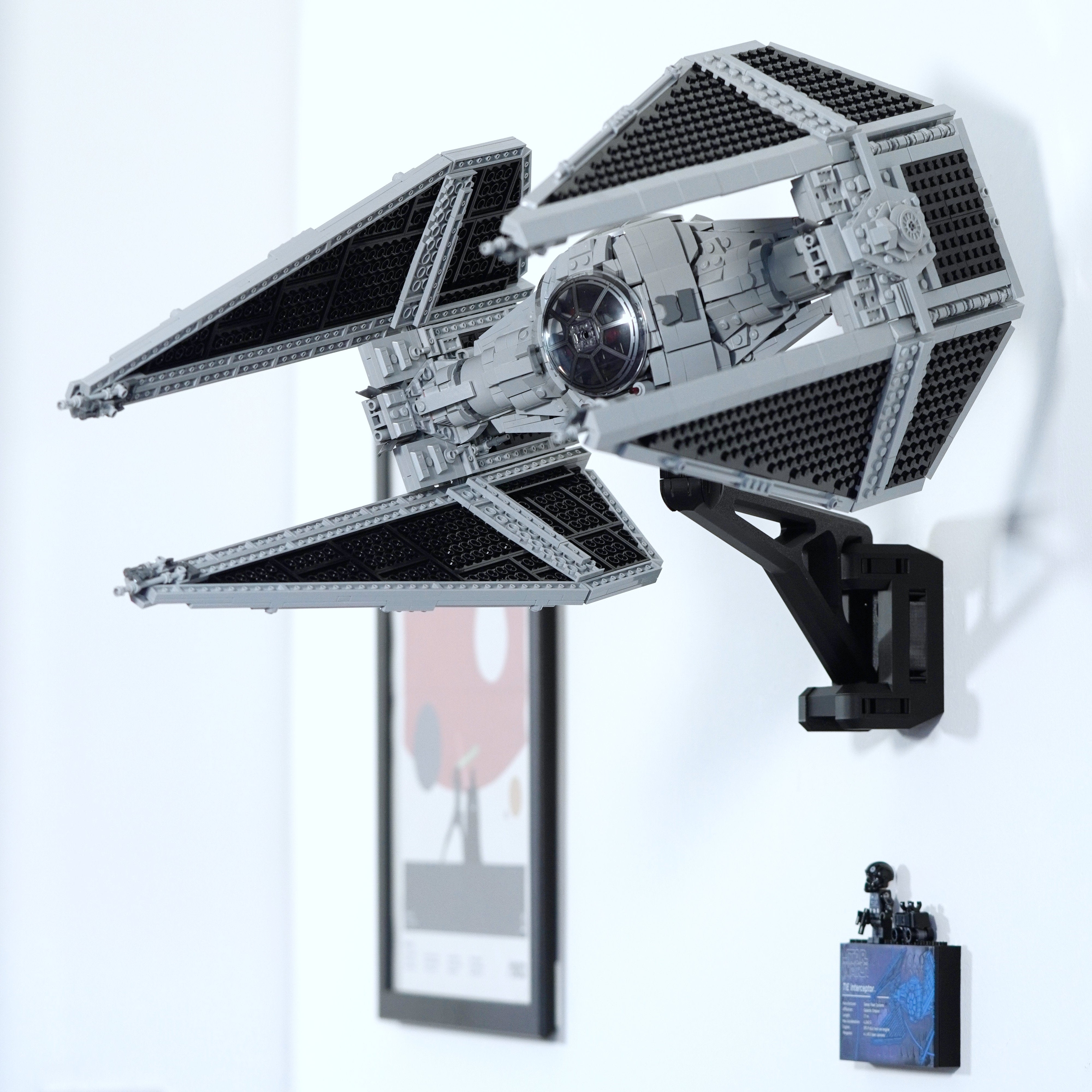 Dette justerbare vægophæng fremviser din UCS Tie Interceptor sikkert og elegant. Den har en drejelig arm og kugleled, der giver mulighed for alsidige vinkler og positioner. Løsningen inkluderer også en separat holder til informationspladen og minifigurer, hvilket sikrer en komplet præsentation af din samling.