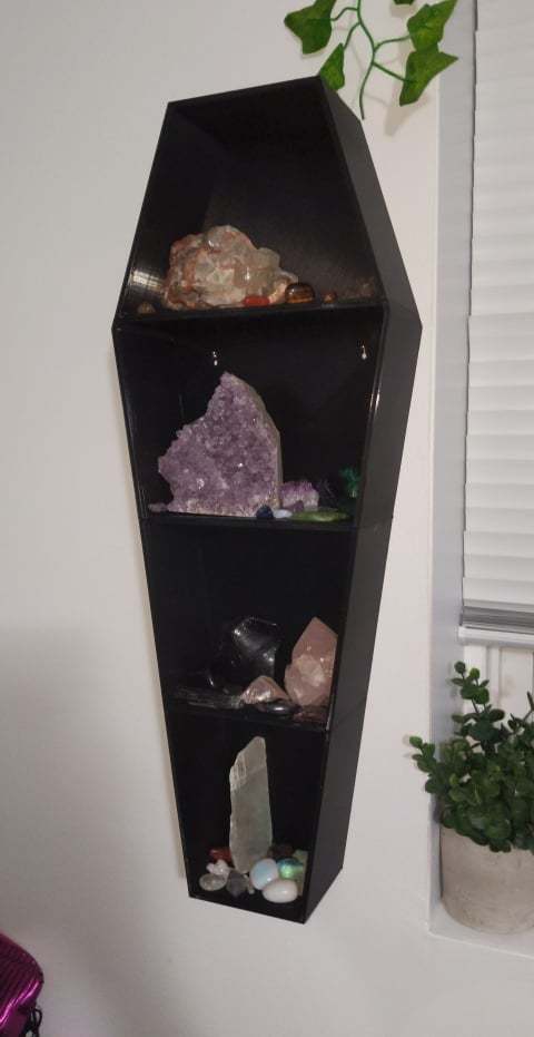 Dieses wandmontierte Sargregal bietet eine unverwechselbare Aufbewahrungslösung, die perfekt in ein Zuhause mit gotischer oder metallischer Einrichtung passt. Mit seinem traditionellen Sargdesign setzt das Regal ein einzigartiges optisches Element an jeder Wand. Es ist robust und stabil konstruiert, sodass Sie eine Vielzahl von Gegenständen – von Kristallen und kleinen Nippes bis hin zu Büchern und Dekoelementen – präsentieren können, ohne befürchten zu müssen, dass sich das Regal unter dem Gewicht verbiegt.