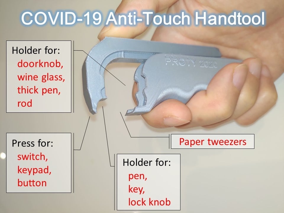 Dieses multifunktionale Werkzeug ohne Schlauch bietet in diesen COVID-19-Zeiten eine einfache Lösung für alltägliche Herausforderungen. Mit seinen vielen Funktionen kann dieses Werkzeug Türen öffnen, Weingläser halten, Schlossknöpfe drehen, Schalter, Tastaturen oder jede Art von Tasten drücken und fungiert als (dicker/dünner) Stifthalter. Darüber hinaus kann es als Pinzette für den Papierkram im Büro, als Schlüsselhalter und sogar als Zauberstabhalter verwendet werden.