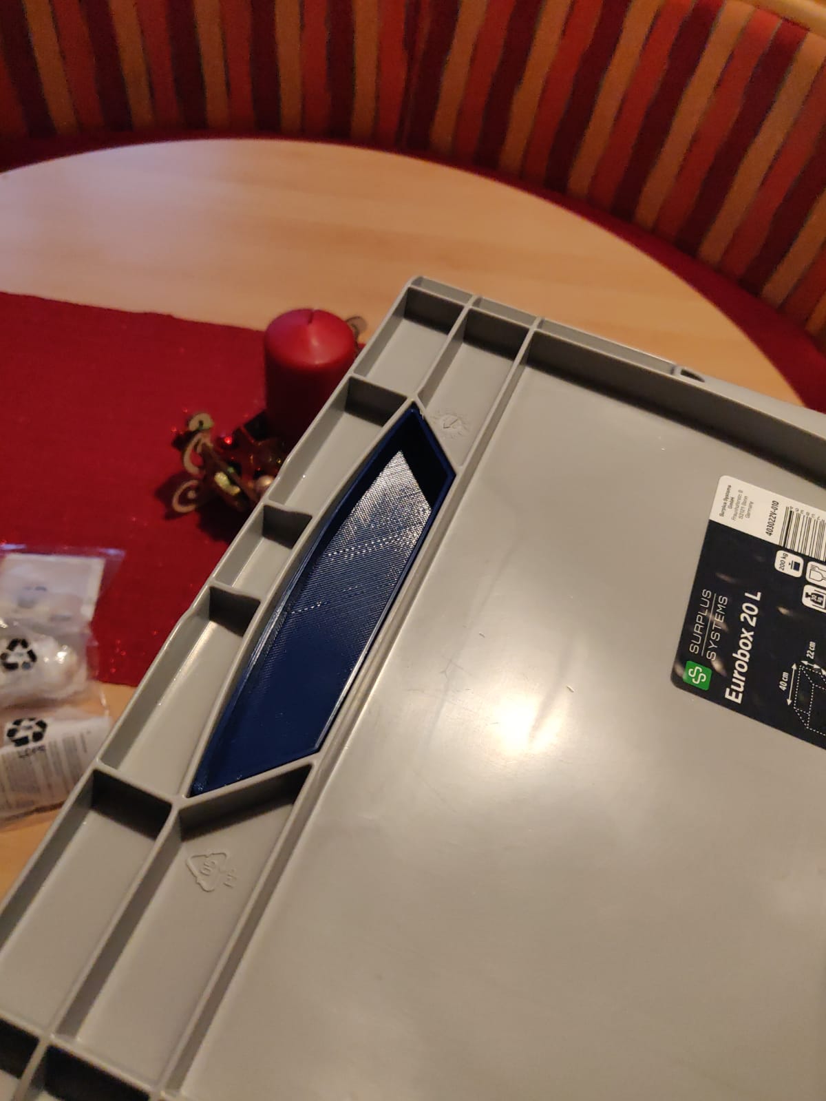 Der Griffeinsatz wird durch Eindrücken in die vorhandenen Öffnungen der Eurobox montiert und sorgt so für einen festen und stabilen Sitz. Für zusätzliche Sicherheit kann der Einsatz auf Wunsch auch eingeklebt werden. Ob zur professionellen Lagerung in der Werkstatt, zur Organisation von Hobbyartikeln oder zum Transportieren – dieser Griffeinsatz verbessert die Benutzerfreundlichkeit deutlich und erleichtert Ihren Alltag.