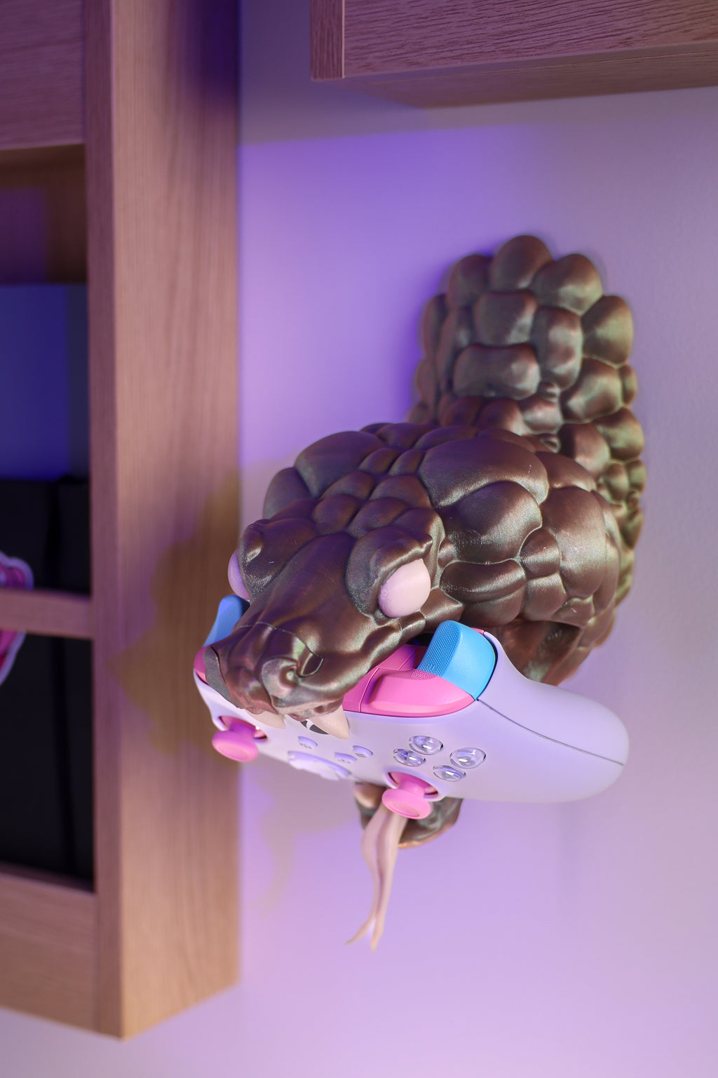 Der durch die Schwerkraft getriebene Griff sorgt dafür, dass Controller neben dem Schlauch einen festen und stabilen Platz haben, ohne zu verrutschen. Dank der 100%igen Print-in-Place -Konstruktion sparen Sie sich den Aufwand beim Zusammenbauen von Teilen, da Kopf, Nase und Zunge mit einem Klick einfach zusammenschnappen. Hängen Sie den Schlauch an die Wand oder legen Sie ihn flach auf Ihren Tisch – Sie haben die Wahl!