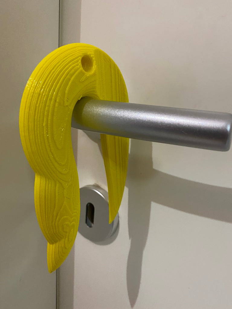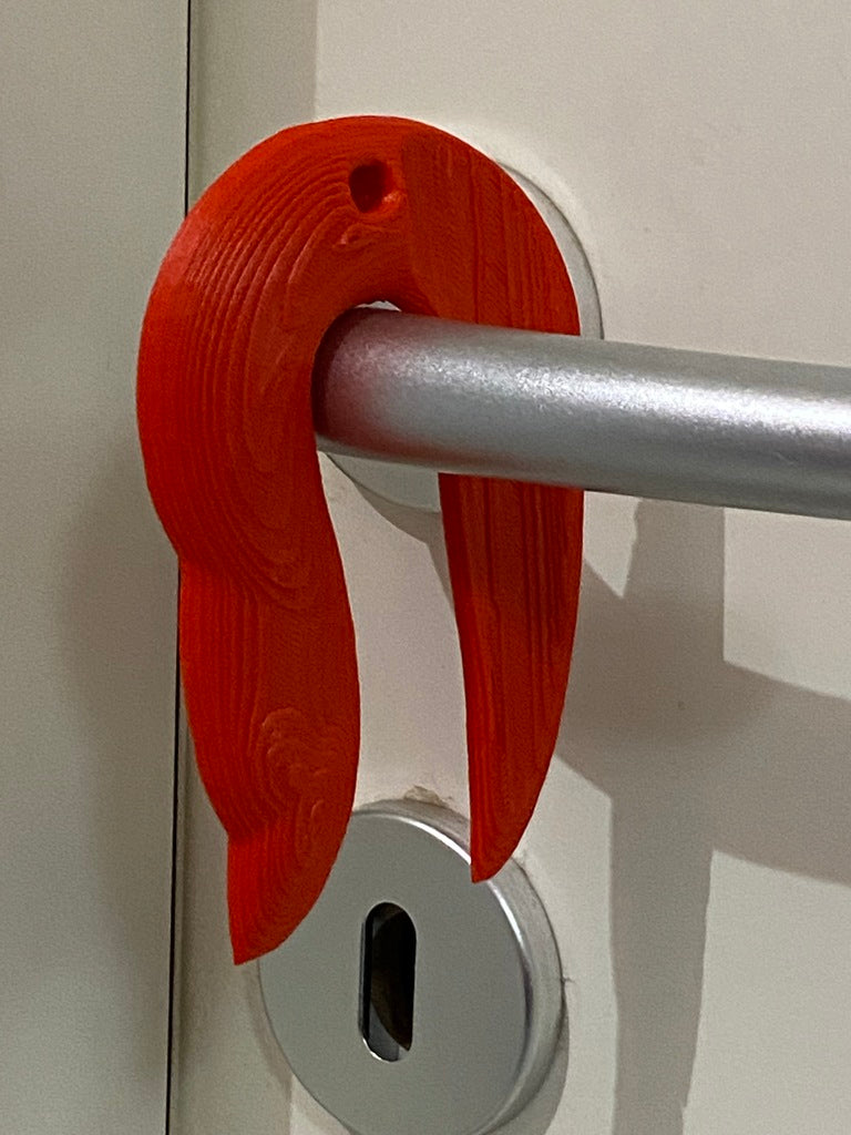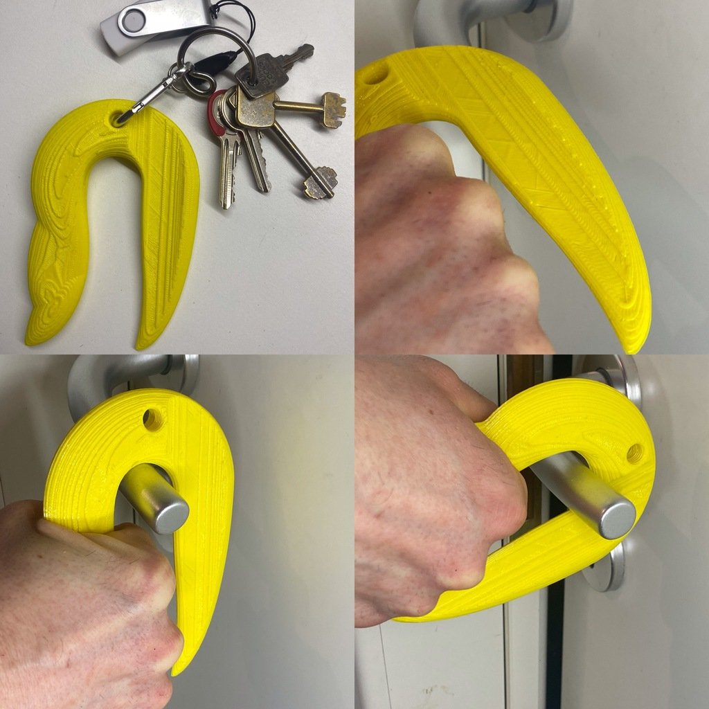 Dies ist der Toucan Sawgrabber, ein Schlüsselanhänger, mit dem Sie Türen öffnen können, ohne die Griffe zu berühren. Es ist sowohl für Rechts- als auch für Linkshänder geeignet. Sehen Sie in diesen Videos, wie es verwendet wird: