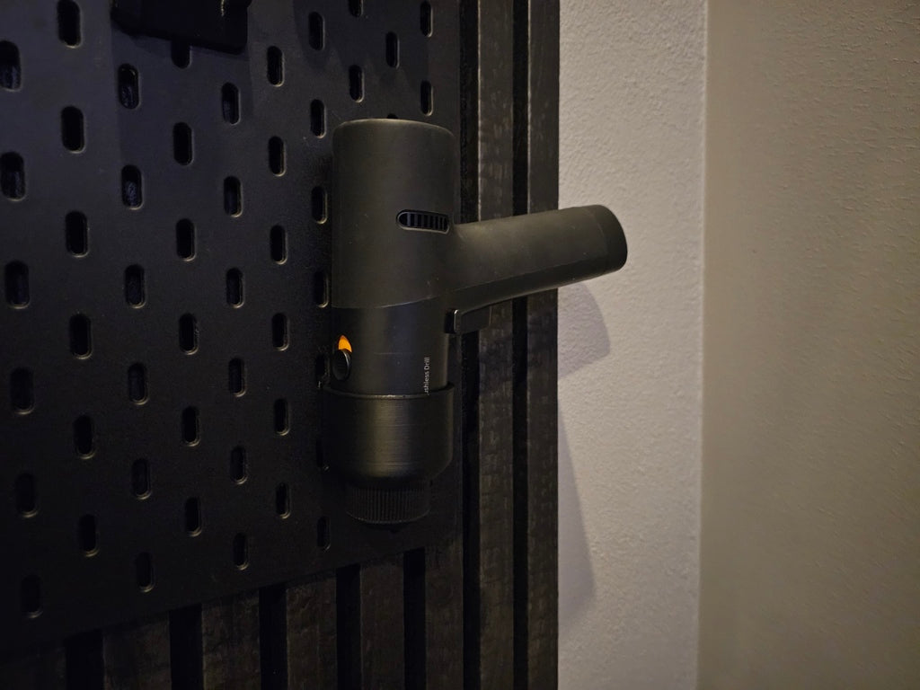 Hierbei handelt es sich um eine Halterung für Akkuschrauber/Bohrschrauber zur Montage auf einer IKEA SKÅDIS-Montageplatte. Es wurde speziell für einen „HOTO Brushless Drill“ entwickelt, kann aber auch mit anderen Marken/Modellen verwendet werden, siehe Abschnitt zur Personalisierung unten.