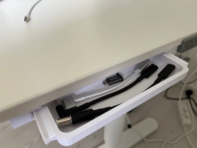 Eine Schublade mit Schiebern für den höhenverstellbaren Schreibtisch „Bekant“ von IKEA. Diese Schublade ist in der Höhe niedriger und in der Länge an den Schreibtisch „Bekant“ angepasst. Perfekt für meine USB-C-Kabel und Adapter.