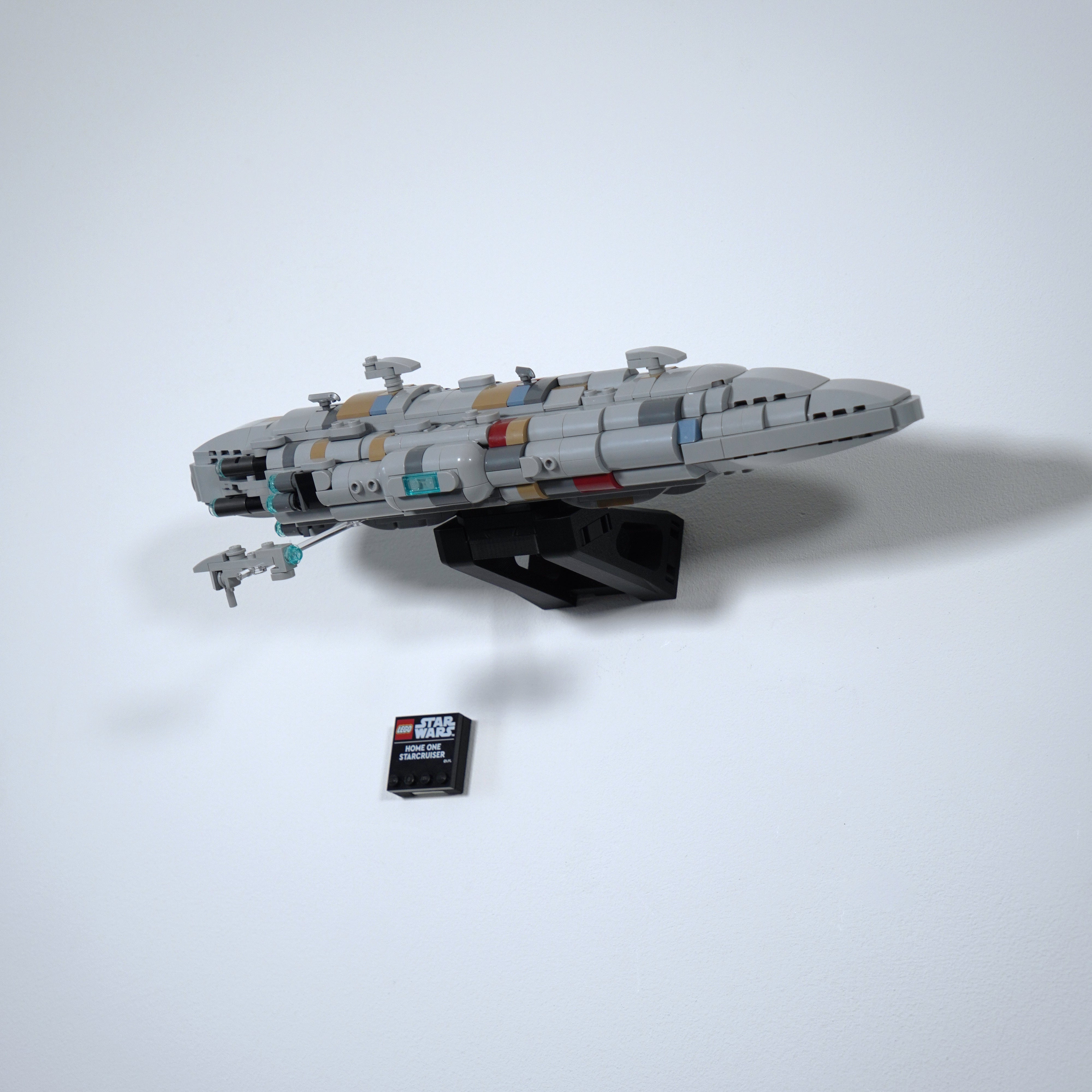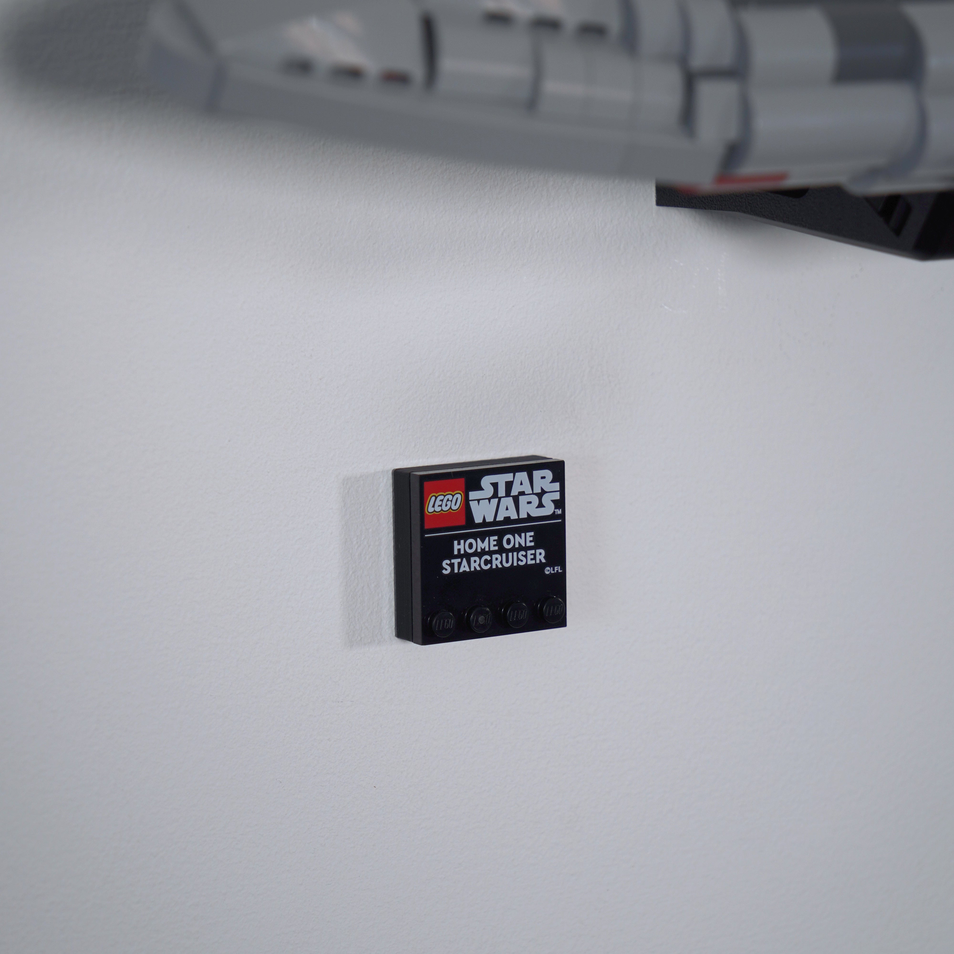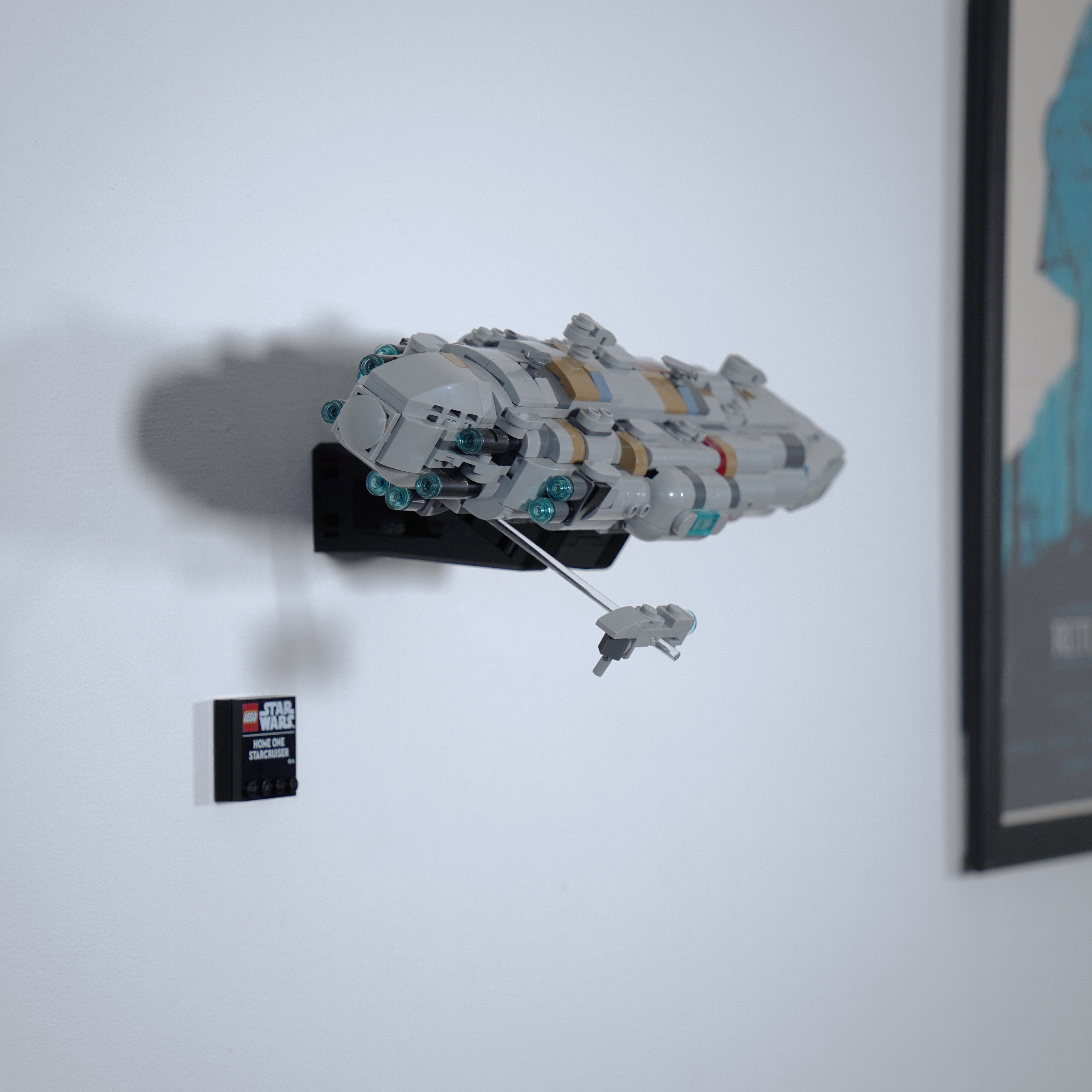 Dette vægbeslag gør det muligt at fremvise din LEGO Home One Starcruiser enten fladt mod væggen eller vinklet til en af siderne. Modellen kan nemt tages ned igen ved behov, og løsningen inkluderer en separat holder til navnepladen for en komplet udstilling i hjemmet.