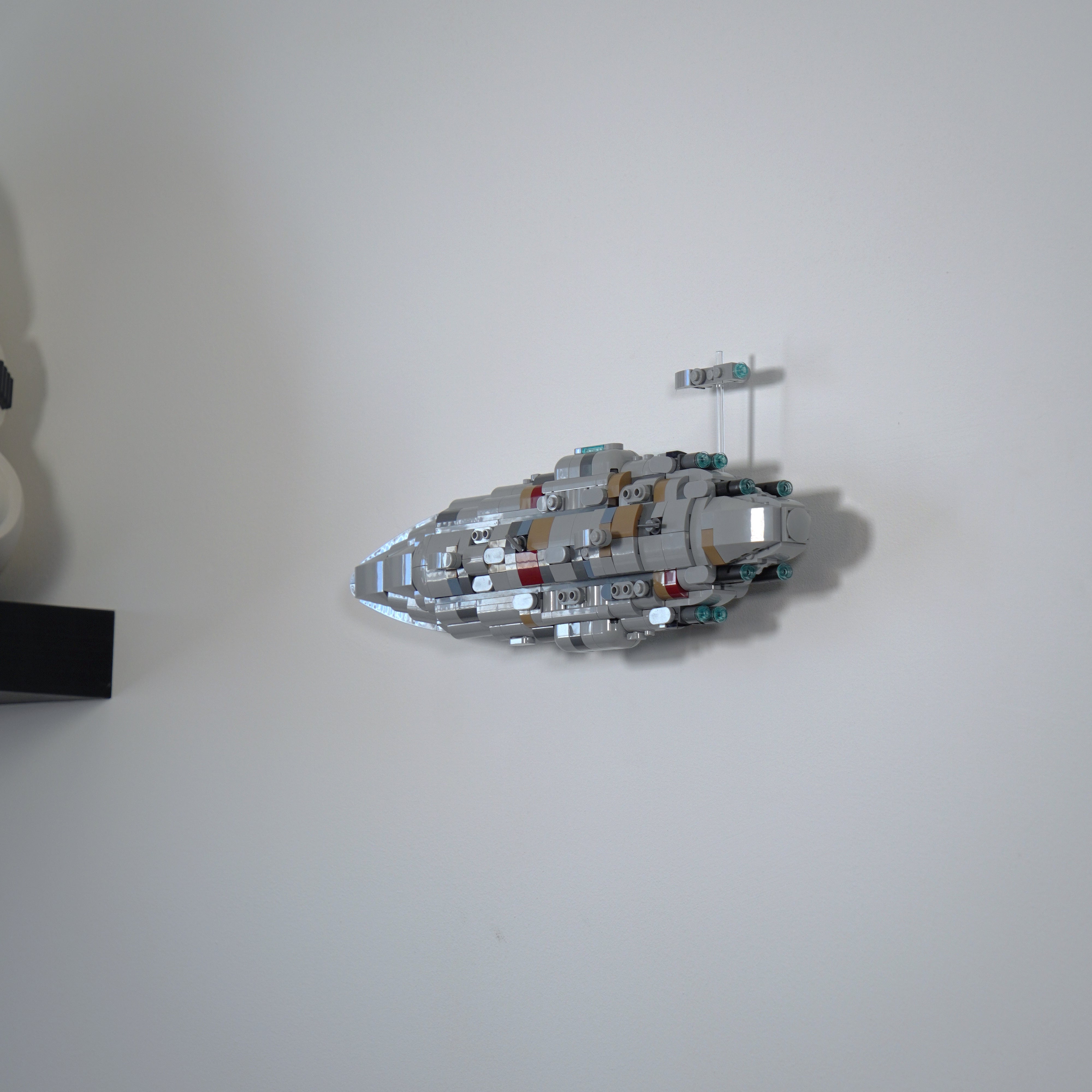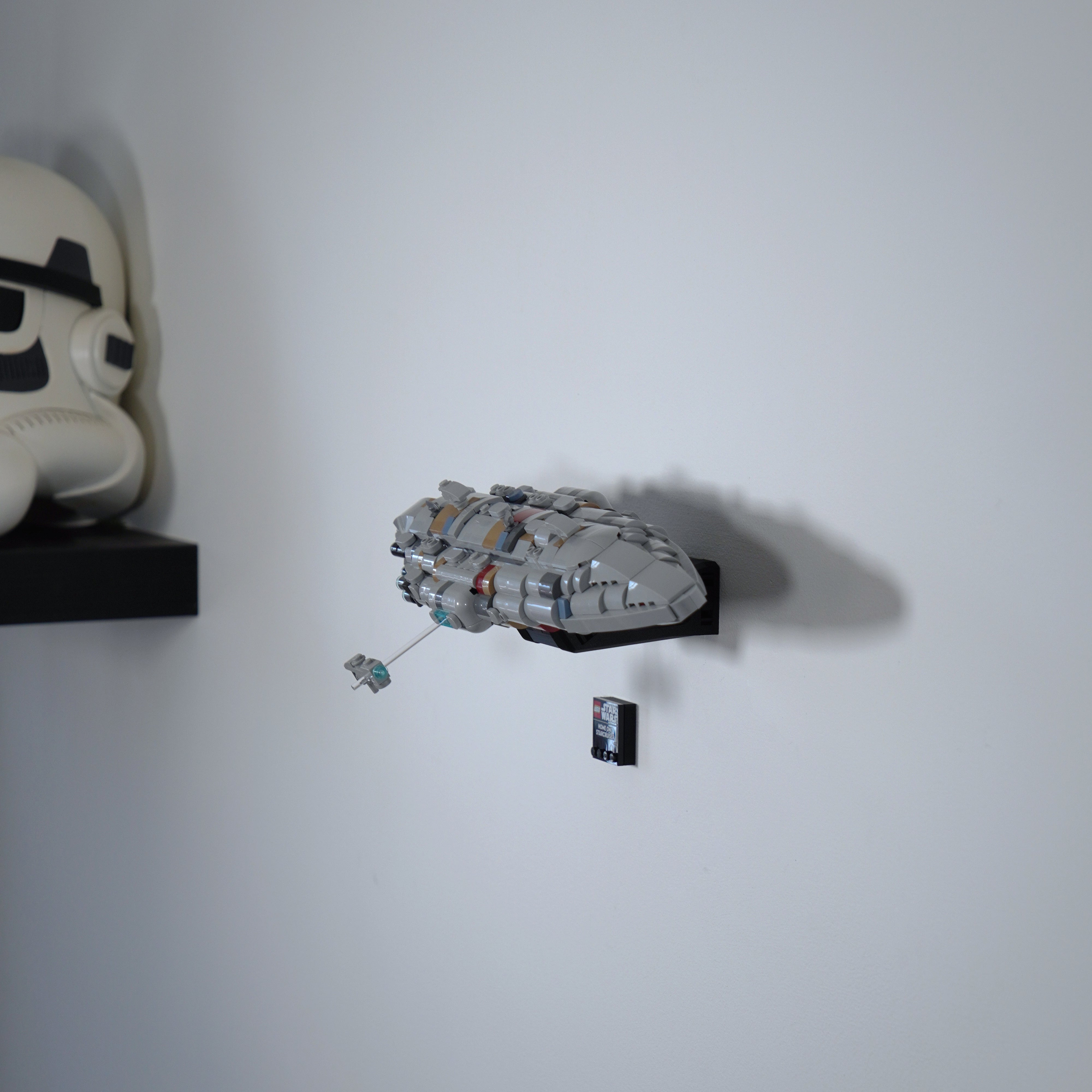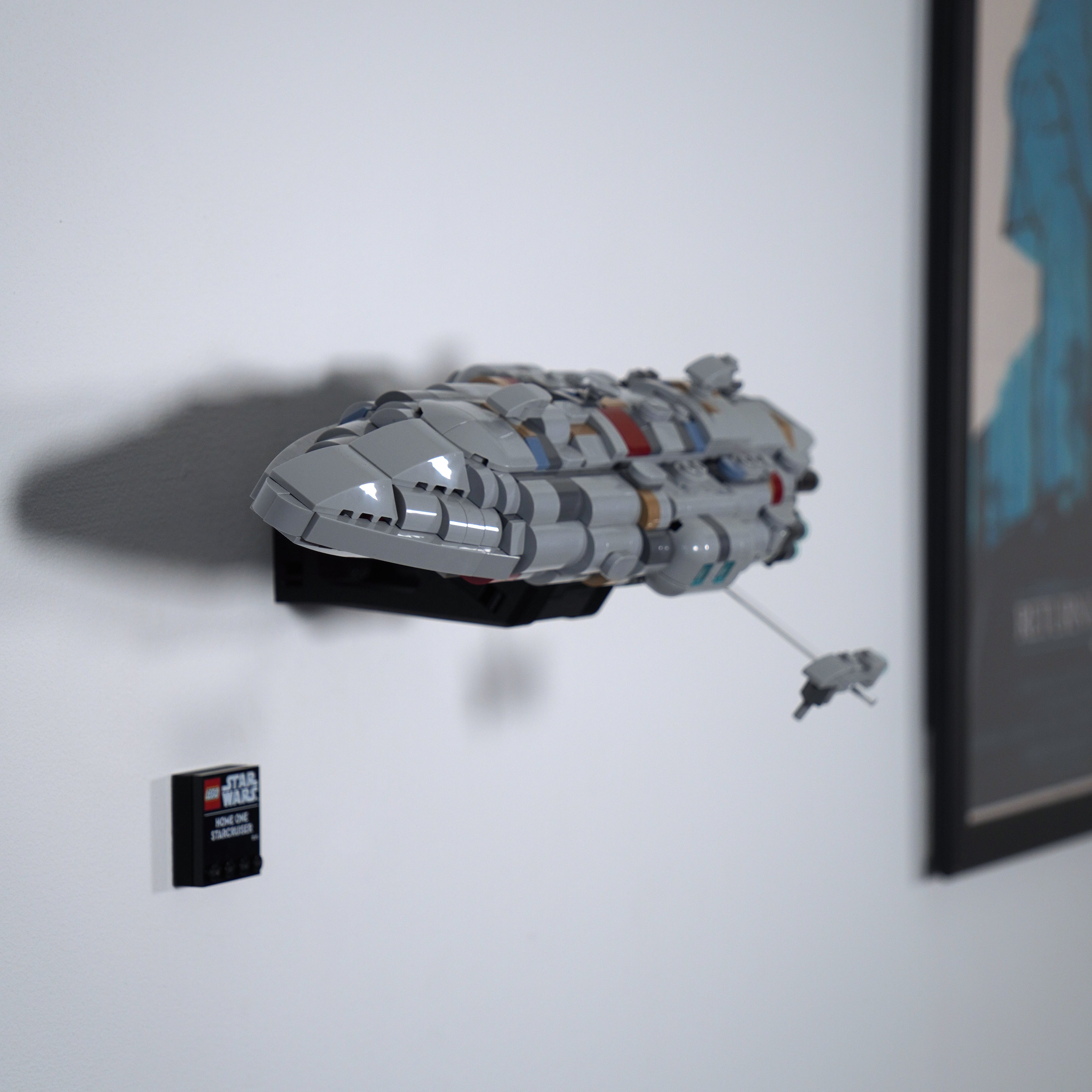 Dette vægbeslag gør det muligt at fremvise din LEGO Home One Starcruiser enten fladt mod væggen eller vinklet til en af siderne. Modellen kan nemt tages ned igen ved behov, og løsningen inkluderer en separat holder til navnepladen for en komplet udstilling i hjemmet.