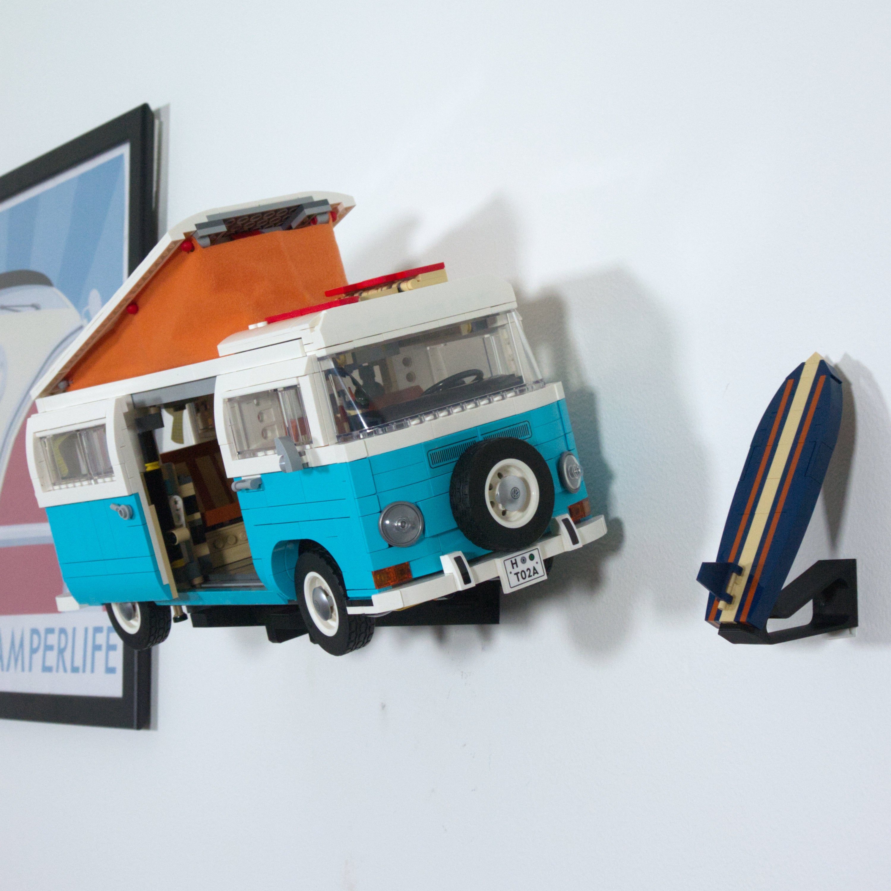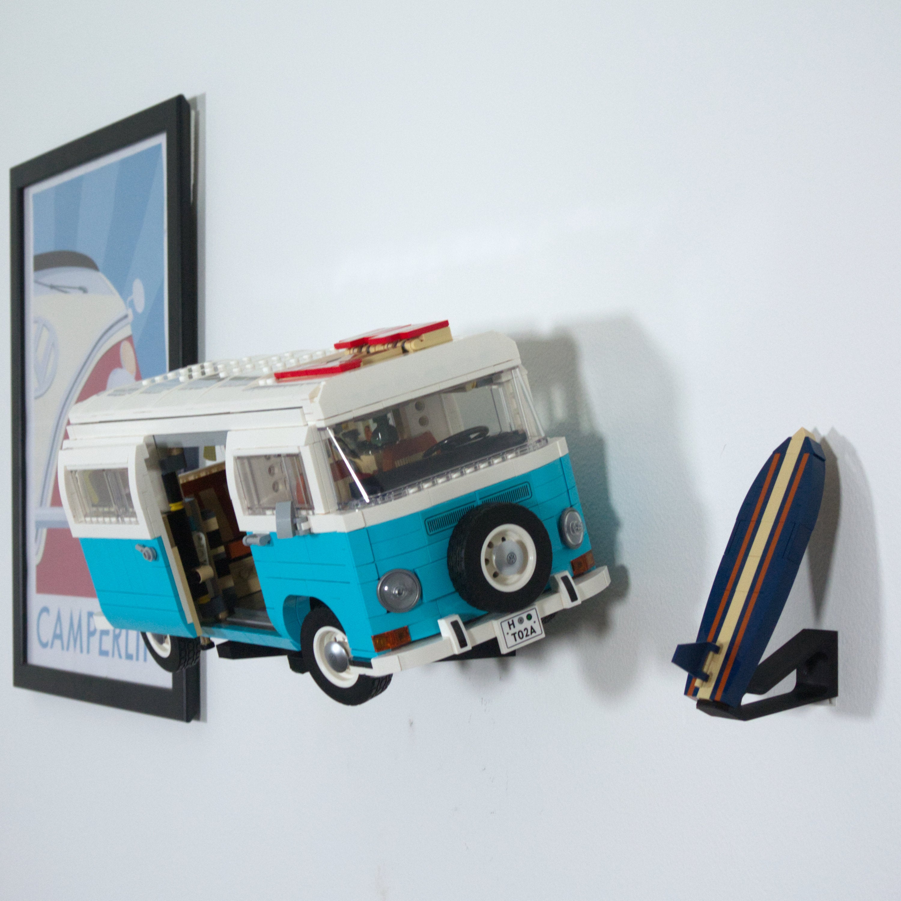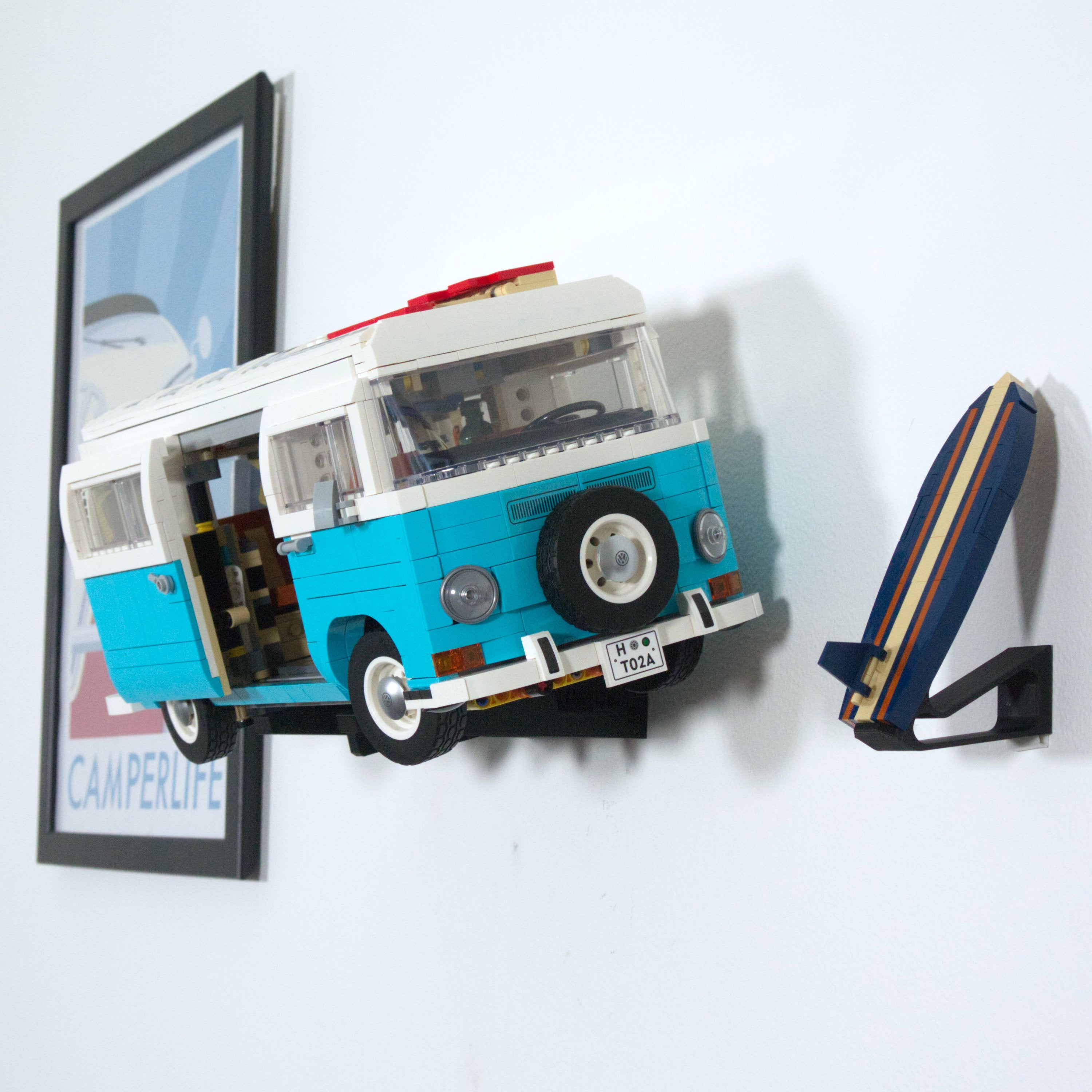 Dette vægbeslag lader dig udstille din LEGO VW Camper Van horisontalt på væggen. Det er kompatibelt med både T1 og T2 modellerne og tillader nem afmontering af bilen. Der medfølger et separat beslag til surfboardet, og selve hovedbeslaget monteres enkelt med en enkelt skrue.