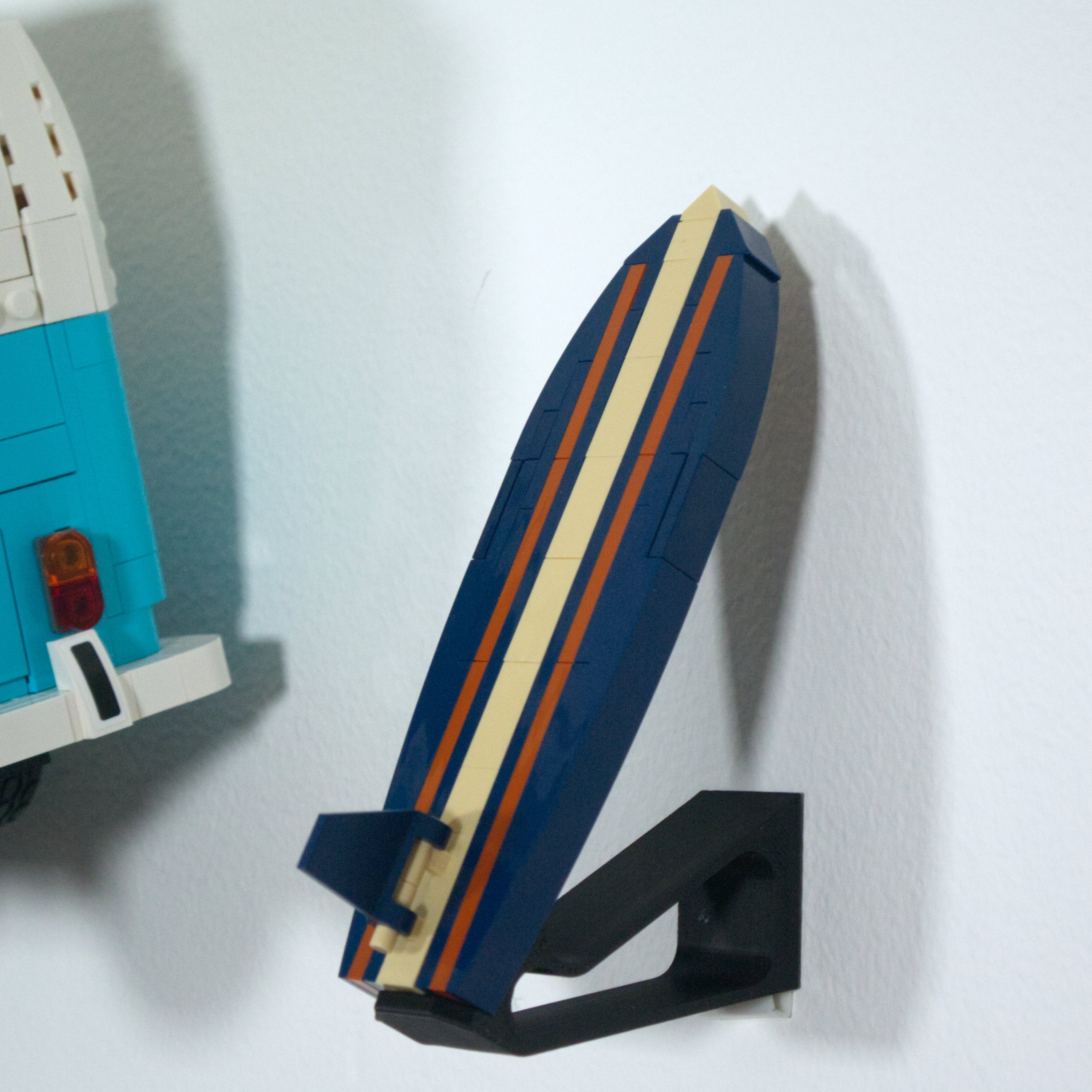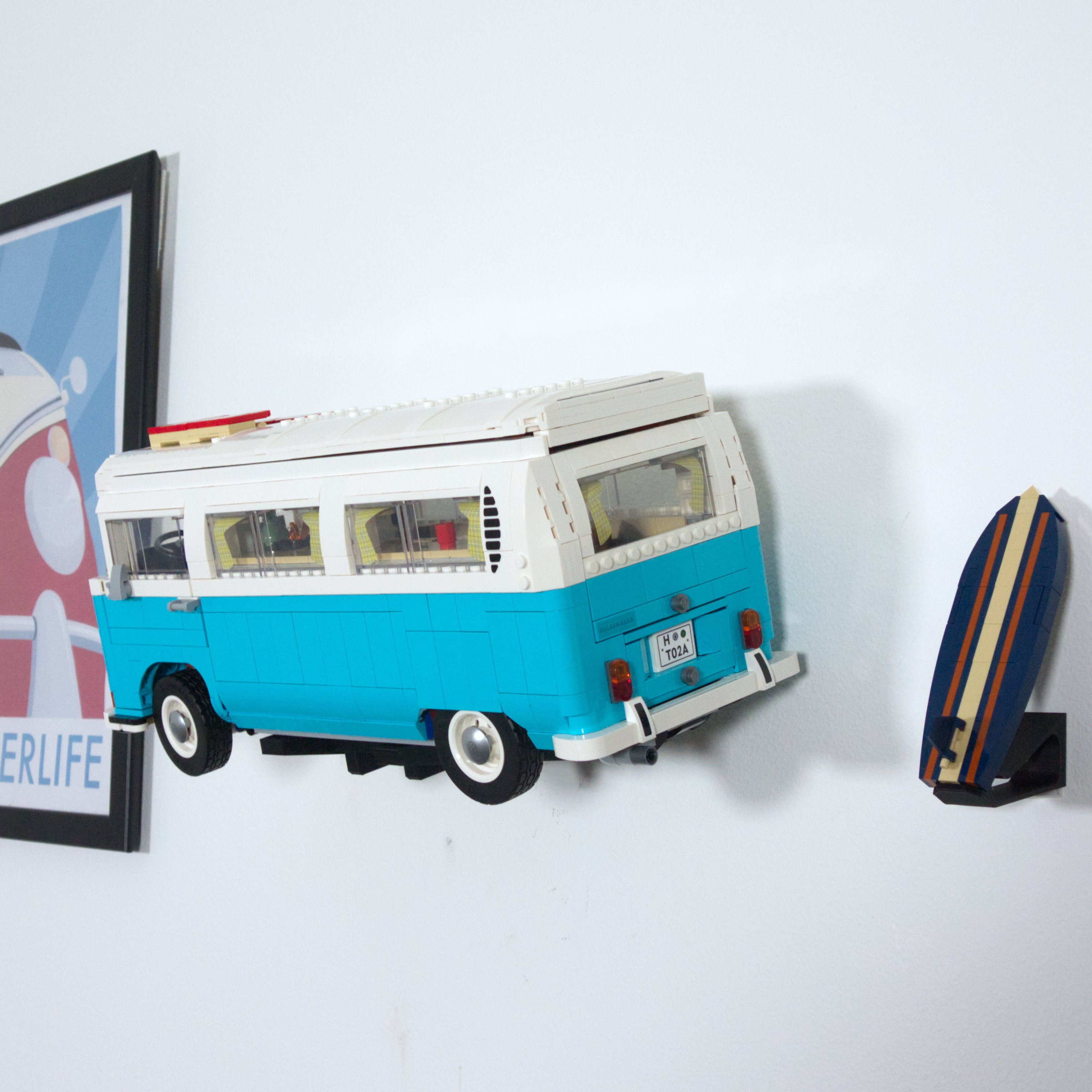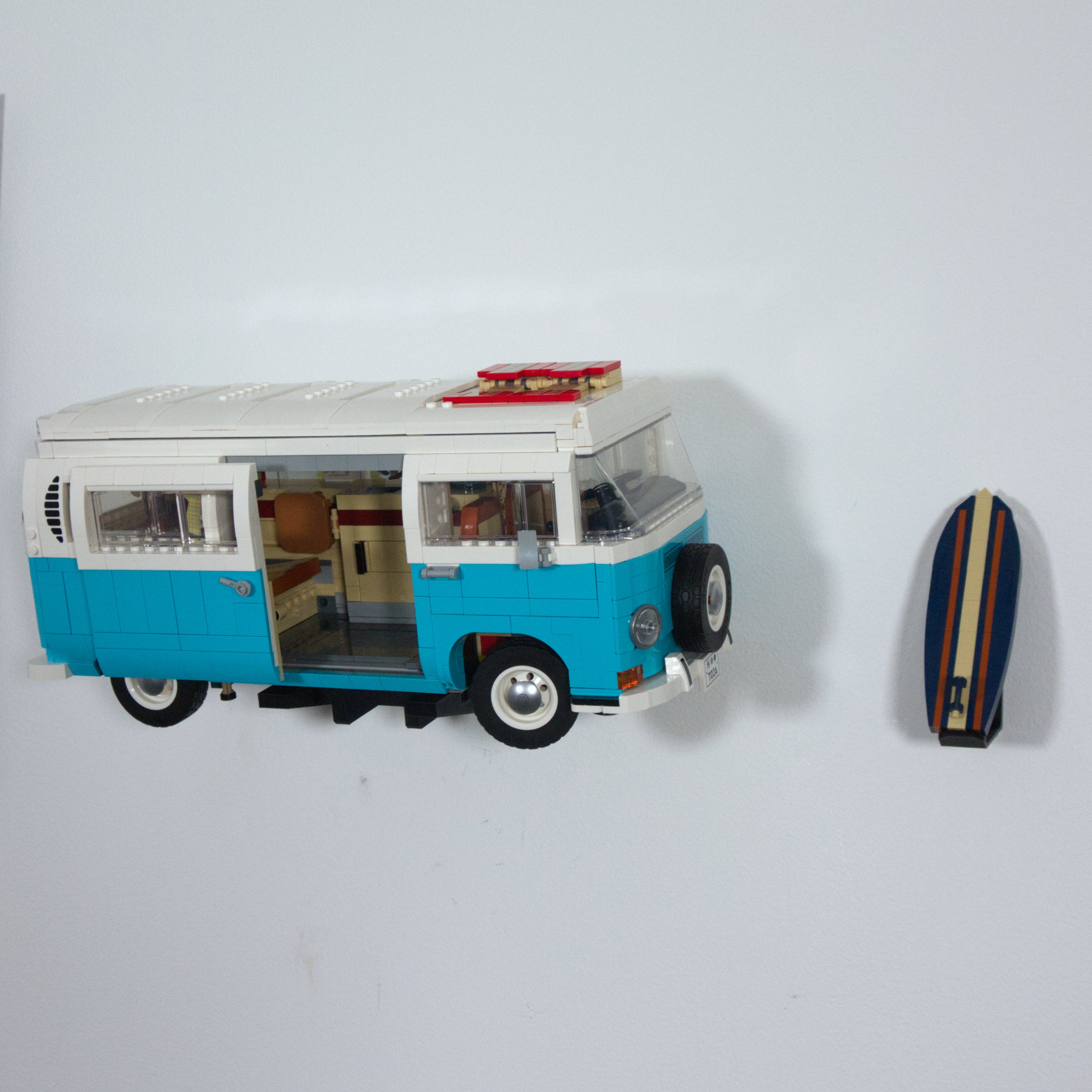 Dette vægbeslag lader dig udstille din LEGO VW Camper Van horisontalt på væggen. Det er kompatibelt med både T1 og T2 modellerne og tillader nem afmontering af bilen. Der medfølger et separat beslag til surfboardet, og selve hovedbeslaget monteres enkelt med en enkelt skrue.