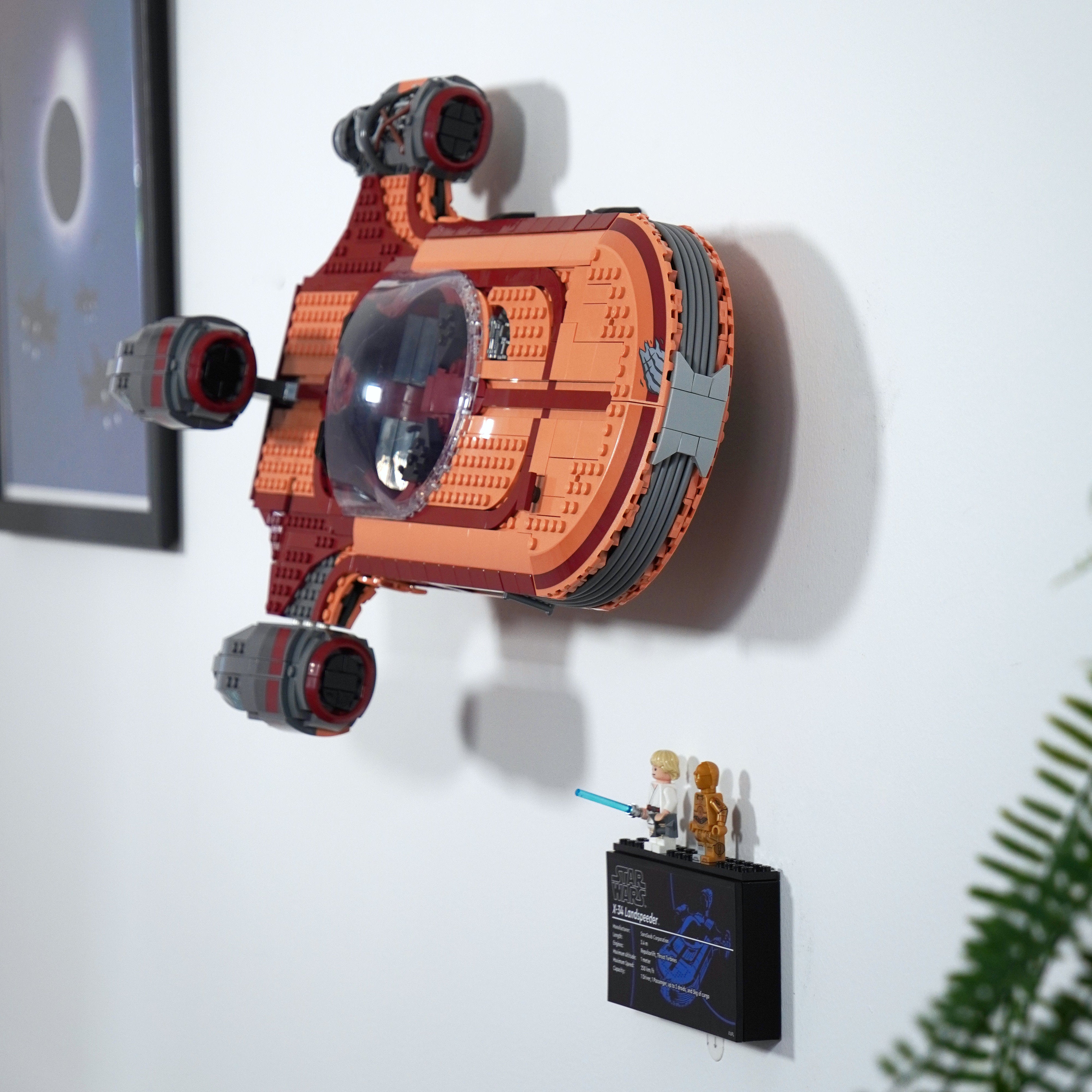 Dette vægbeslag er designet specifikt til Luke Skywalkers Landspeeder sæt 75341. Det giver mulighed for at præsentere modellen vendt mod enten venstre eller højre. Løsningen inkluderer holder til informationspladen og plads til minifigurerne, og montering kræver blot to almindelige vægskruer.