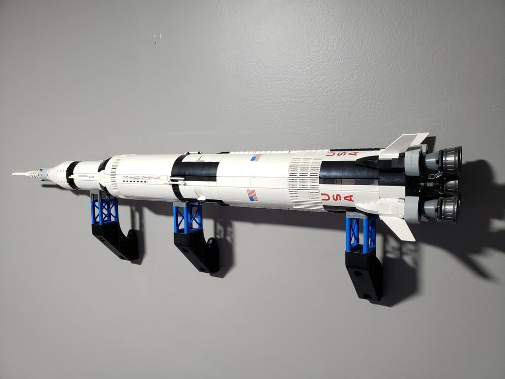 Wandständer für das Lego Saturn V-Modell. Es verfügt über Funktionen zur Aufnahme von Lego-Stäben, die mit dem blauen Ständer verbunden werden, der dem Modell beiliegt. Perfekt, um Ihr Lego Saturn V-Modell an der Wand zu präsentieren.