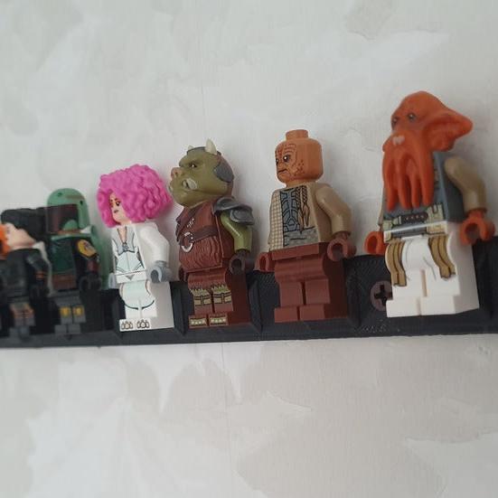 Eine kleine Wandhalterung, die Platz für sechs LEGO Minifiguren bietet. Es verfügt über zwei Löcher für 3,5-mm-Schrauben. Minifiguren mit Umhängen, Jetpacks oder anderem Heckzubehör erfordern möglicherweise eine zusätzliche 1x2-Platte.