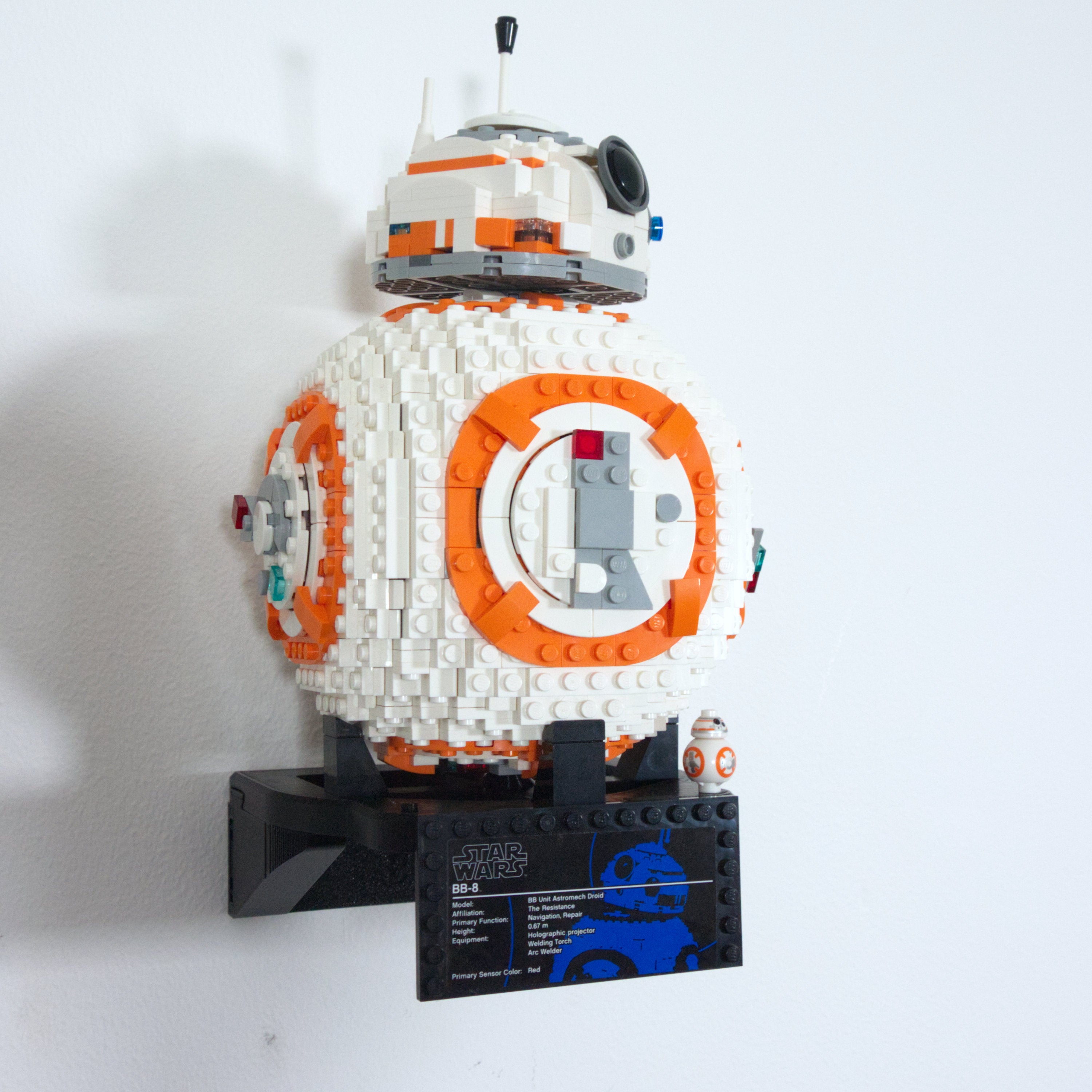 Dette vægophæng er designet specifikt til Star Wars BB-8 75187 sættet. Det muliggør nem ophængning og aftagning af modellen ved hjælp af en enkelt skrue. Beslaget har desuden en integreret holder til både informationskortet og den tilhørende minifigur for en komplet præsentation.