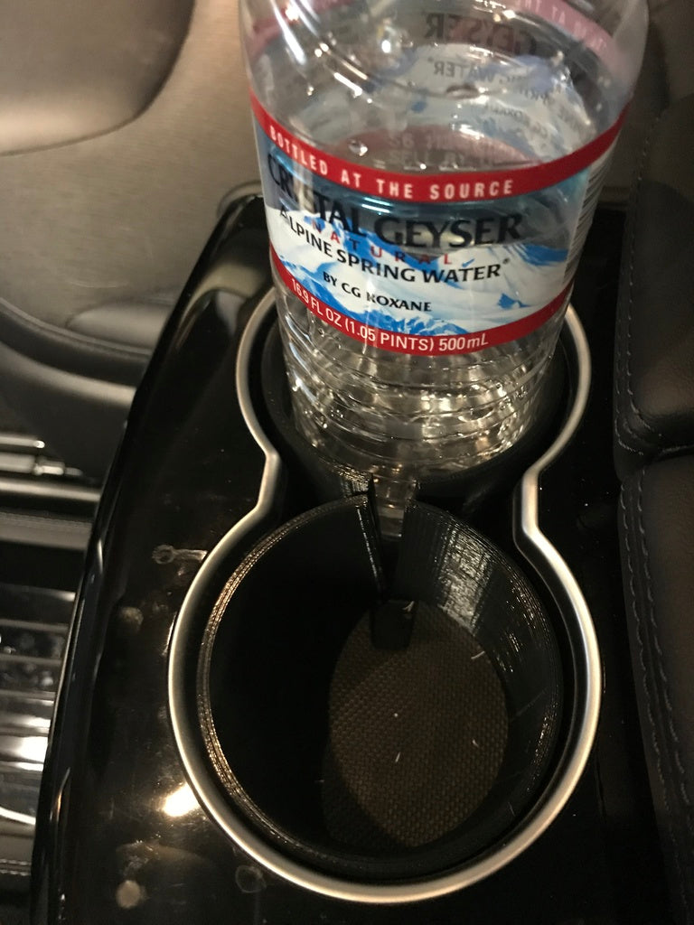 Ein Flaschenhalter für den Tesla, der speziell entwickelt wurde, um zu verhindern, dass 500-ml-Wasserflaschen im Getränkehalter des Tesla umkippen. Dieser Flaschenhalter passt in einen Getränkehalter mit einer Öffnung von ca. 79 mm Durchmesser oben und eine Tiefe von 66 mm.