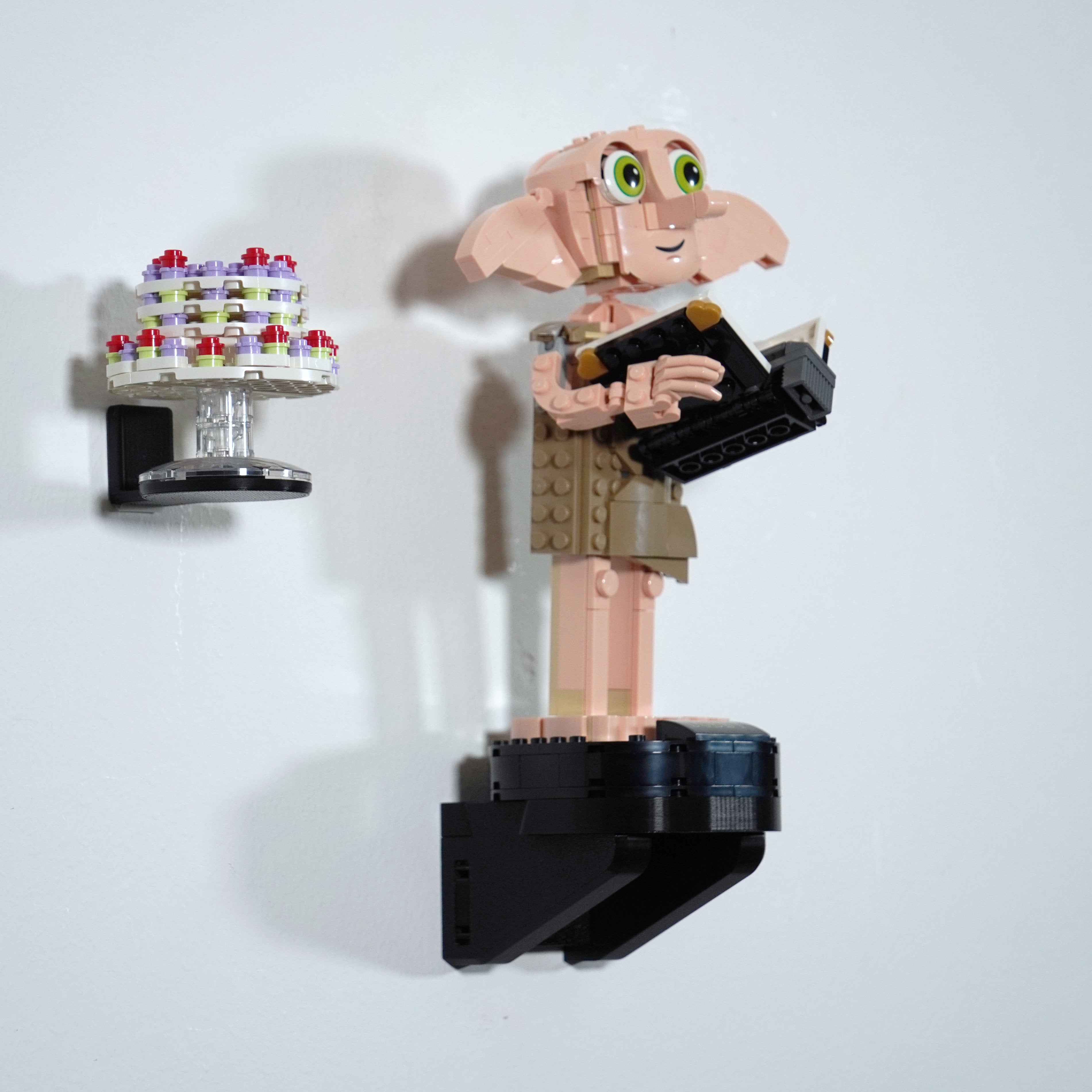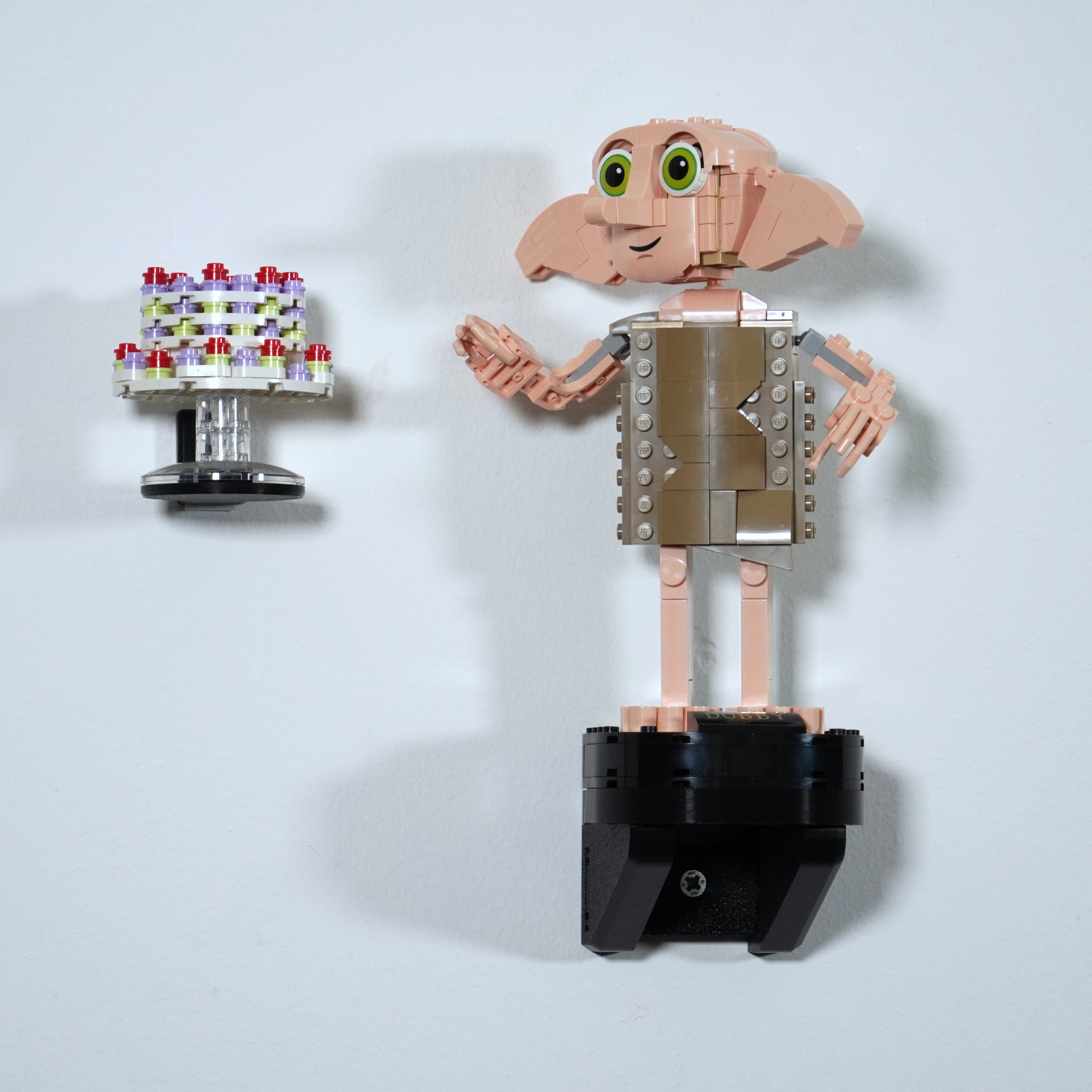 Diese Wandhalterung bietet eine stabile Präsentation für das Harry Potter Dobby Hauselfen-Set 76421. Die Lösung ermöglicht es, das Modell bei Bedarf einfach wieder abzunehmen. Ein Befestigungspunkt für das Kuchenzubehör ist enthalten, und die Halterung wird mit zwei Schrauben sicher an der Wand befestigt, um eine ansprechende Präsentation zu gewährleisten.