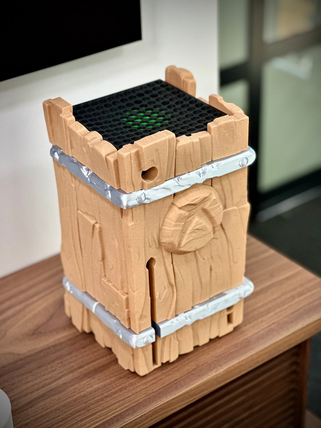 Zur Farbauswahl gehören klassisches Holz und ein auffälliges Rot, aber der Realität sind nur durch Ihre eigene Kreativität Grenzen gesetzt – personalisieren Sie Ihr Gaming-Setup mit Designs, die Ihre Konsole wie ein legendäres Fantasy-Relikt vor aller Augen verbergen.